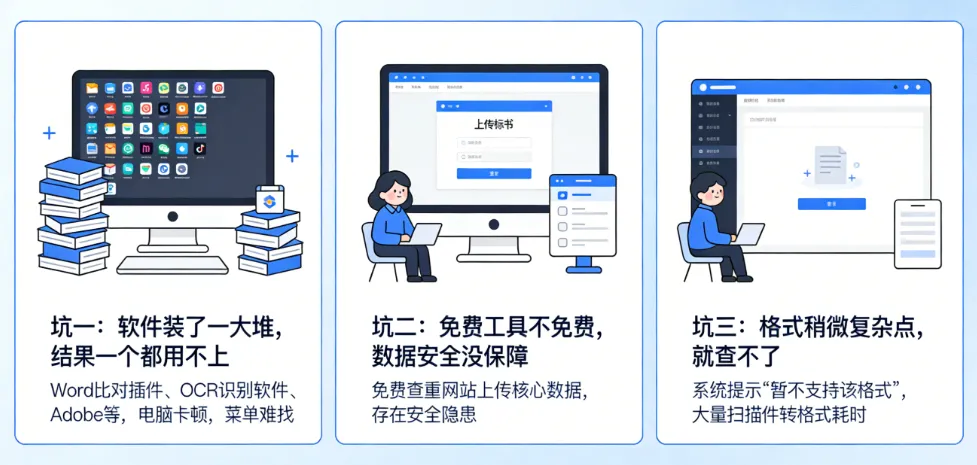 坑一:软件装了一大堆,结果一个都用不上想查文字,装个Word比对插件;想查图片里的字,装个OCR识别软件;想查PDF,再装个Adobe。最后电脑卡成狗,软件菜单找了半天,还没开始查已经累了。