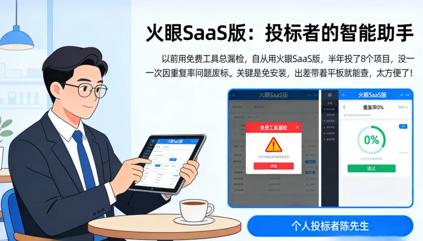 个人投标者陈先生:“以前用免费工具总漏检,自从用火眼SaaS版,半年投了8个项目,没一次因重复率问题废标。关键是免安装,出差带着平板就能查,太方便了!”