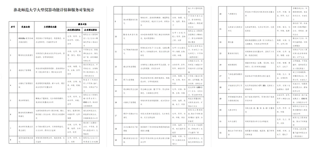 无论你是高校师生需要测试分析,还是企业研发团队急需技术支持,这里都能为你提供专业、精准的服务。下面这份超全的《淮北师范大学大型仪器功能详情和服务对象统计》带你一表看懂——哪些仪器可以测?能测什么?谁能用?统统清清楚楚!