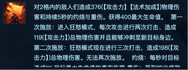 鳄鱼强度得益于技能效果。对2格内的敌人们造成物理伤害和持续5秒的灼烧和重伤,获得400最大生命值。第一次释放进入狂怒模式,每次攻击进行两次打击、造成物理伤害并冲刺到新目标。第二次释放时狂怒模式进行三次打击。鳄鱼这个技能自带重伤效果,可以理解为自带日炎装备,并且可以造成多段范围伤害,实属强力输出前排。