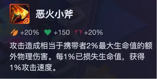 恶火小斧攻击造成相当于携带者2%最大生命值的额外物理伤害,每1%已损失生命值,获得1%攻击速度。鳄鱼棋子定位是前排战士,生命值是不少的,可以打出更高的额外伤害。其技能还可以造成多段伤害,让恶火小斧的效果打出更好的效果。该神器的物理加成、生命值和20%的吸血对于鳄鱼的战士定位来说,属性很不错,十分适配。让鳄鱼的强度更高,甚至成为最强新春使者。