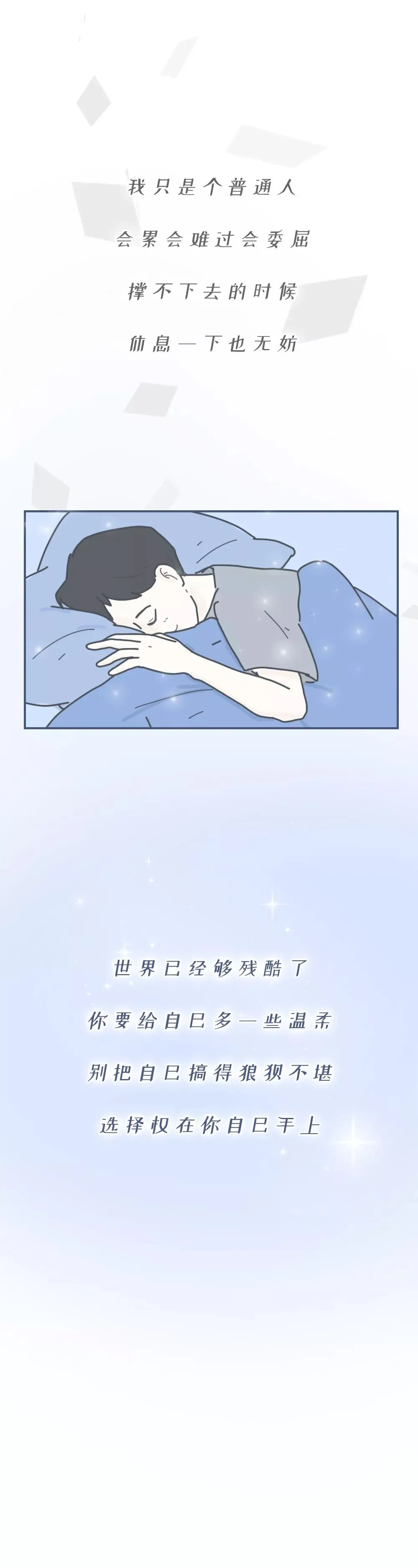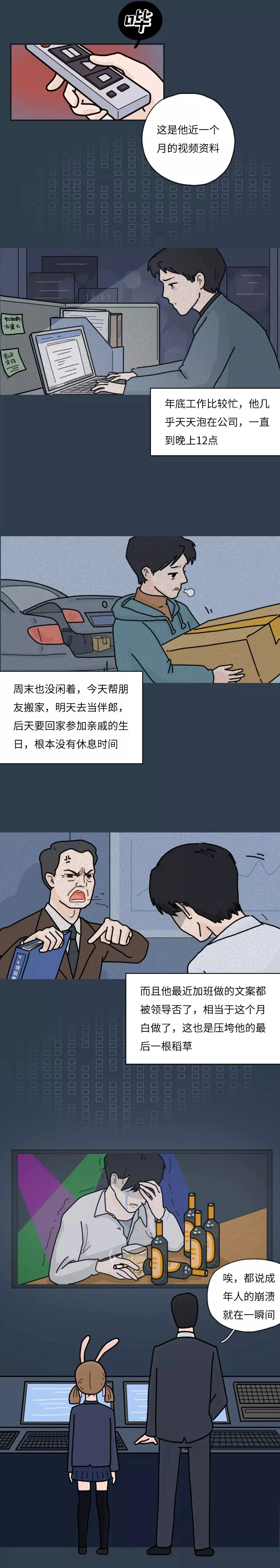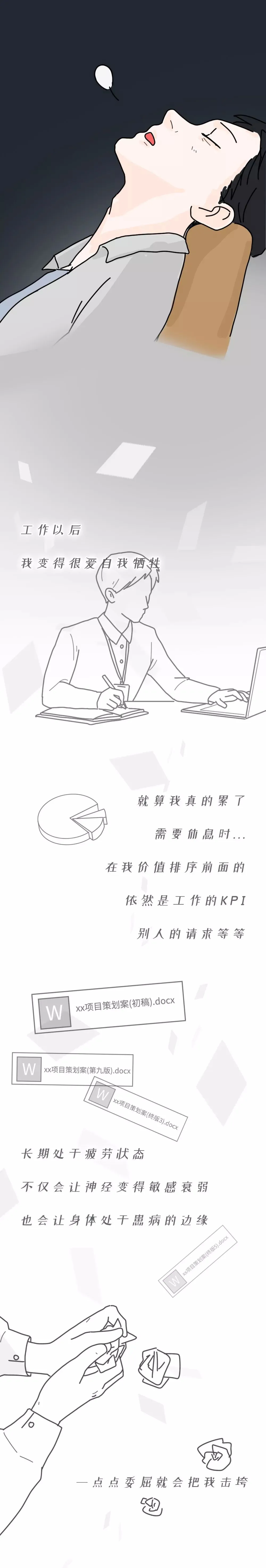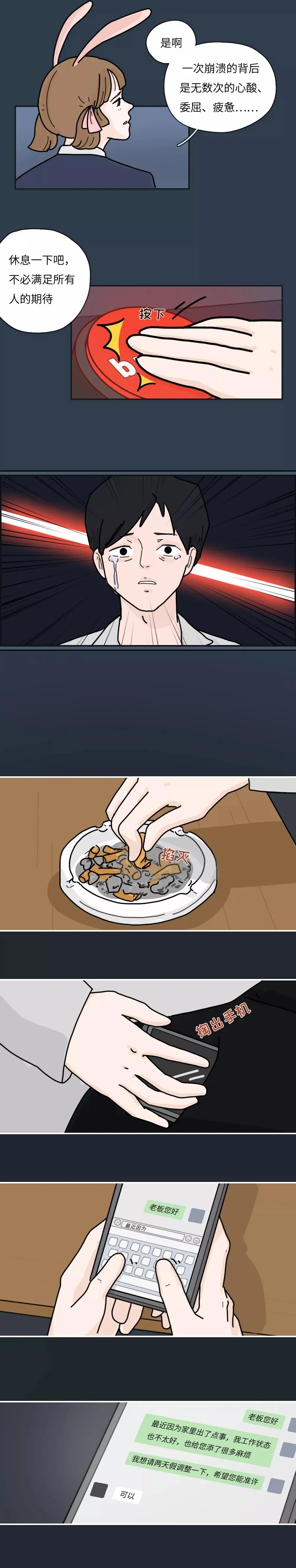 写在最后:兔姐经常和朋友说起“小型崩溃”这个词。它不是那种哭天抢地般的悲伤,只是撑不住了,躲在被窝里偷偷摸几把泪水来发泄。前段时间,兔姐就经历了一次小型崩溃。工作不顺心再加休息不好,已经让自己精神紧绷了,没想到就这时患上了感冒,身体的不舒服一下子就把兔姐打垮了,委屈的眼泪瞬间夺眶而出。网上经常说:“成年人的崩溃都是一瞬间的”。但是真的是这样吗?其实不是的。看似让你崩溃的是那一碗热腾腾的家乡面、是醉酒后坐地铁时摔倒的那一跤;但真正让你崩溃的,是你在外面受的委屈和不得不独自咽下的心酸。有人说这就是生活,生活本就该穿着有石子的鞋走路。可是,你明明知道石子硌脚,为什么不停下来倒掉呢?兔姐在上次小型崩溃结束后,学会了break(停顿)。像是写字要停顿、吃饭时要喝水一样,我们的生活、工作、考试也需要停顿。拼了命的努力不是完全正确,停下才能缓冲和充电。压力大的时候,就找方法排遣一下;撑不住的时候,就钻空子睡个懒觉。就像歌曲《hey jude》里面有这样唱:“hey jude ,Don’t make it bad ,Don‘t carry the world upon your shoulder”嘿,朱迪,别把事情想的那么糟,别把整个世界都扛在你的肩上。千万别等到身体亮了红灯、精神出现疾病时,再后悔没有好好爱护自己。希望大家脸皮厚一点、凡事看开一点、过的开心一点。生活不需要你时刻都拼尽全力,好好爱自己才不枉此生。别再把自己逼到崩溃边缘了。