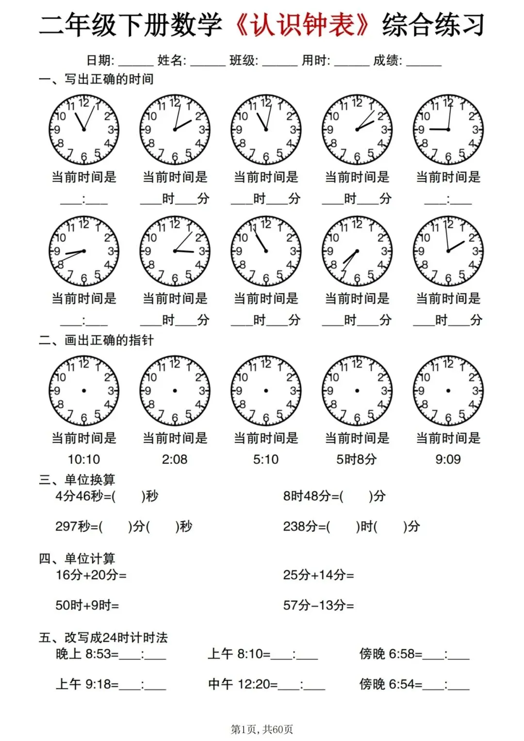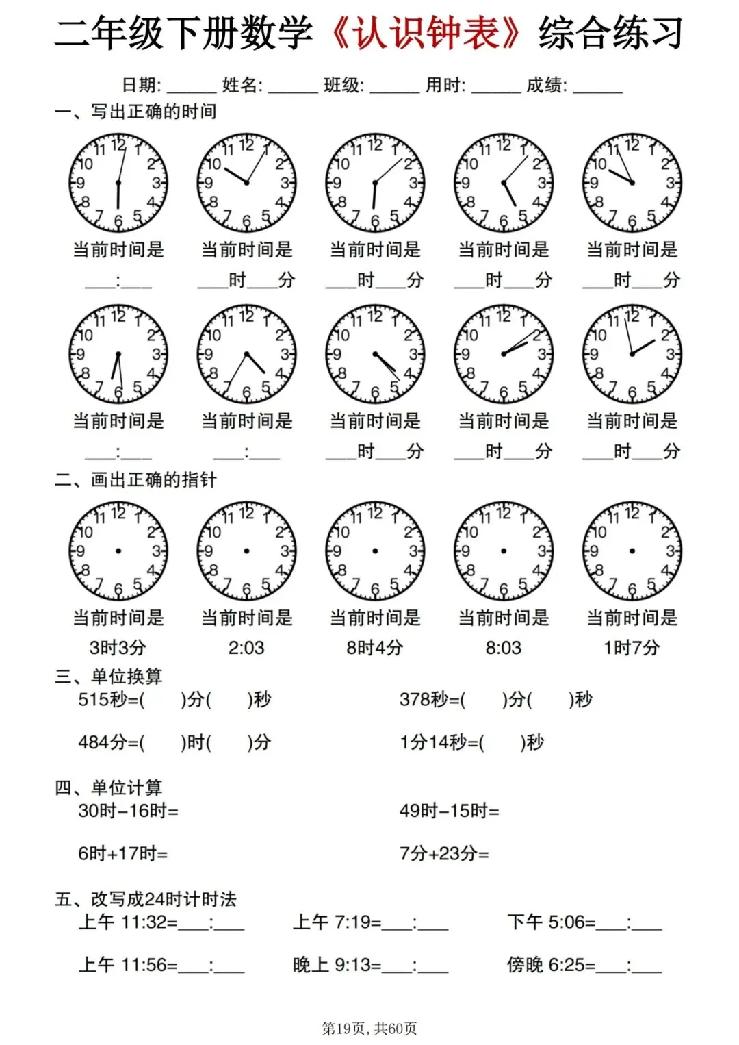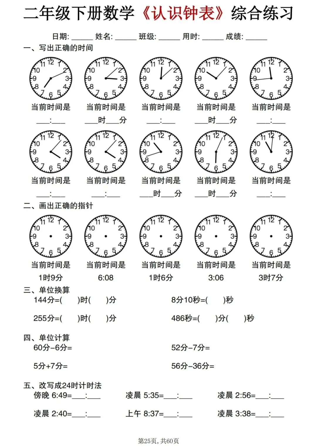 二下 数学《认识钟表》专项练习/ 电子版可下载打印