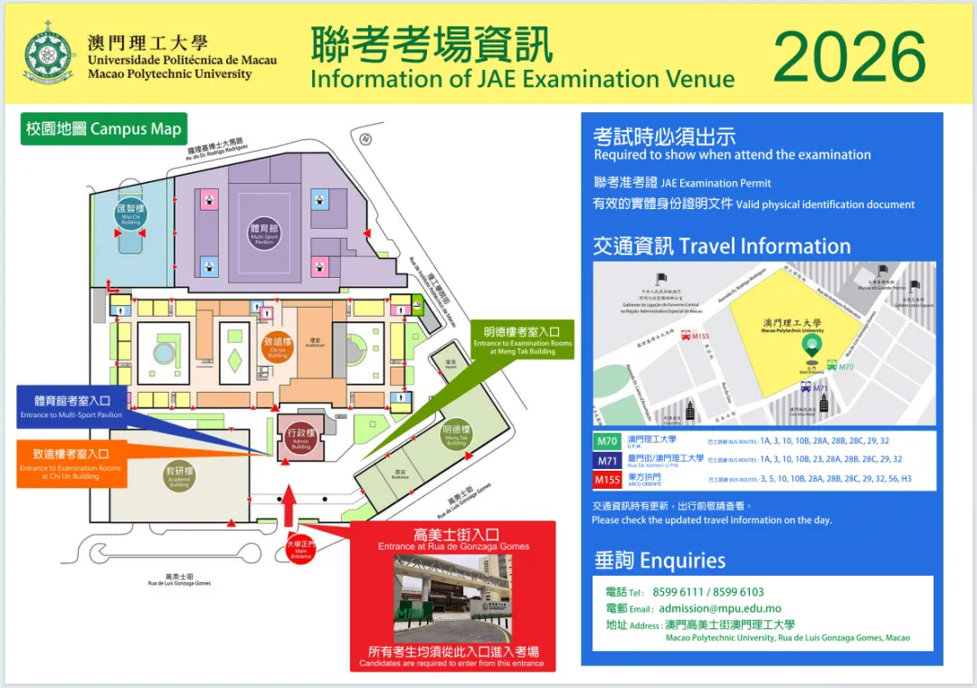 • 澳门四校联考的考场将设在澳门大学、澳门科技大学、澳门理工大学及澳门旅游学院等四所高校。