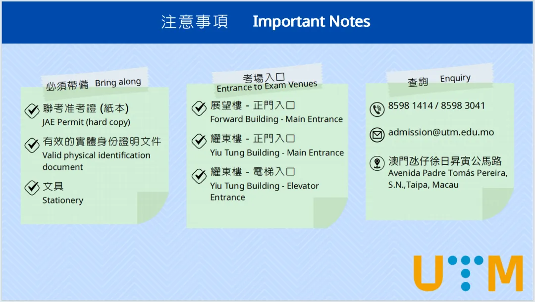 • 报考特定课程(如澳门大学物理科)的考生,将获得两份准考证,包括“澳门大学入学考试准考证”和“澳门四校联合入学考试准考证”。