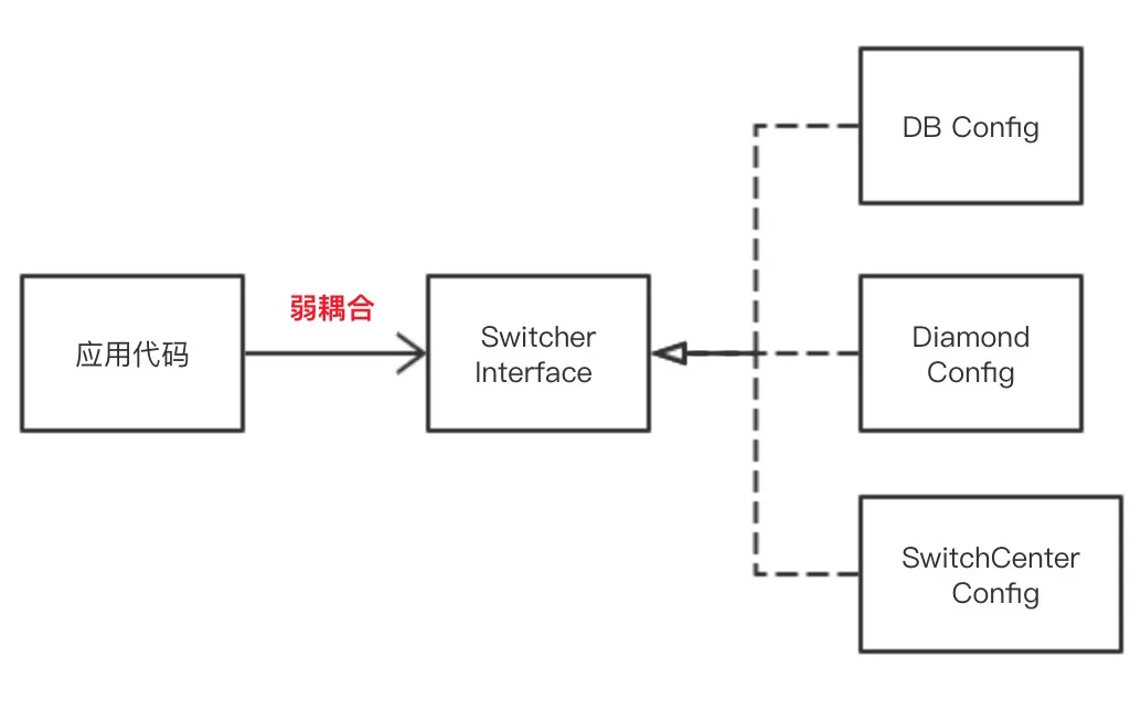 但是这样做的问题很明显,当需要切换新的配置实现的话,就不得不扒开原来的应用代码做修改了。更恰当的做法应该是提供一个Switch的接口,让不同的实现去实现这个接口,从而在切换配置实现的时候,应用代码不再需要更改了。
