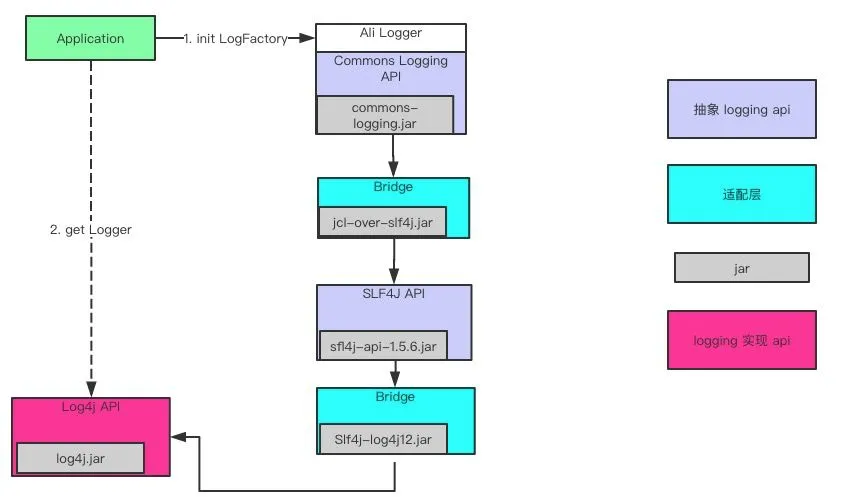 当logback出来之后,事情开始变得复杂,当我们想替换一个新的logger vendor的时候,为了尽量减少代码改动,不得不上各种Bridge(桥接),到最后日志代码变成了谁也看不懂的代码迷宫。下图就是我费了九头二虎之力,才梳理清楚的一个老业务系统的日志框架依赖情况。