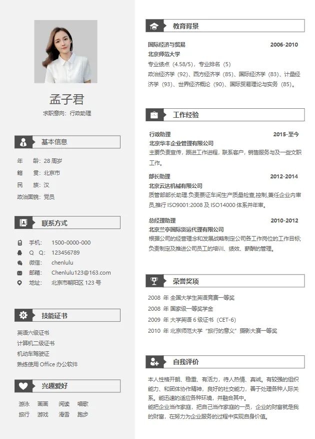极简排版、重点突出,无多余装饰,用数据与成果说话。适配金融、咨询、行政等严谨岗位,干净利落,让 HR 快速抓取核心信息。