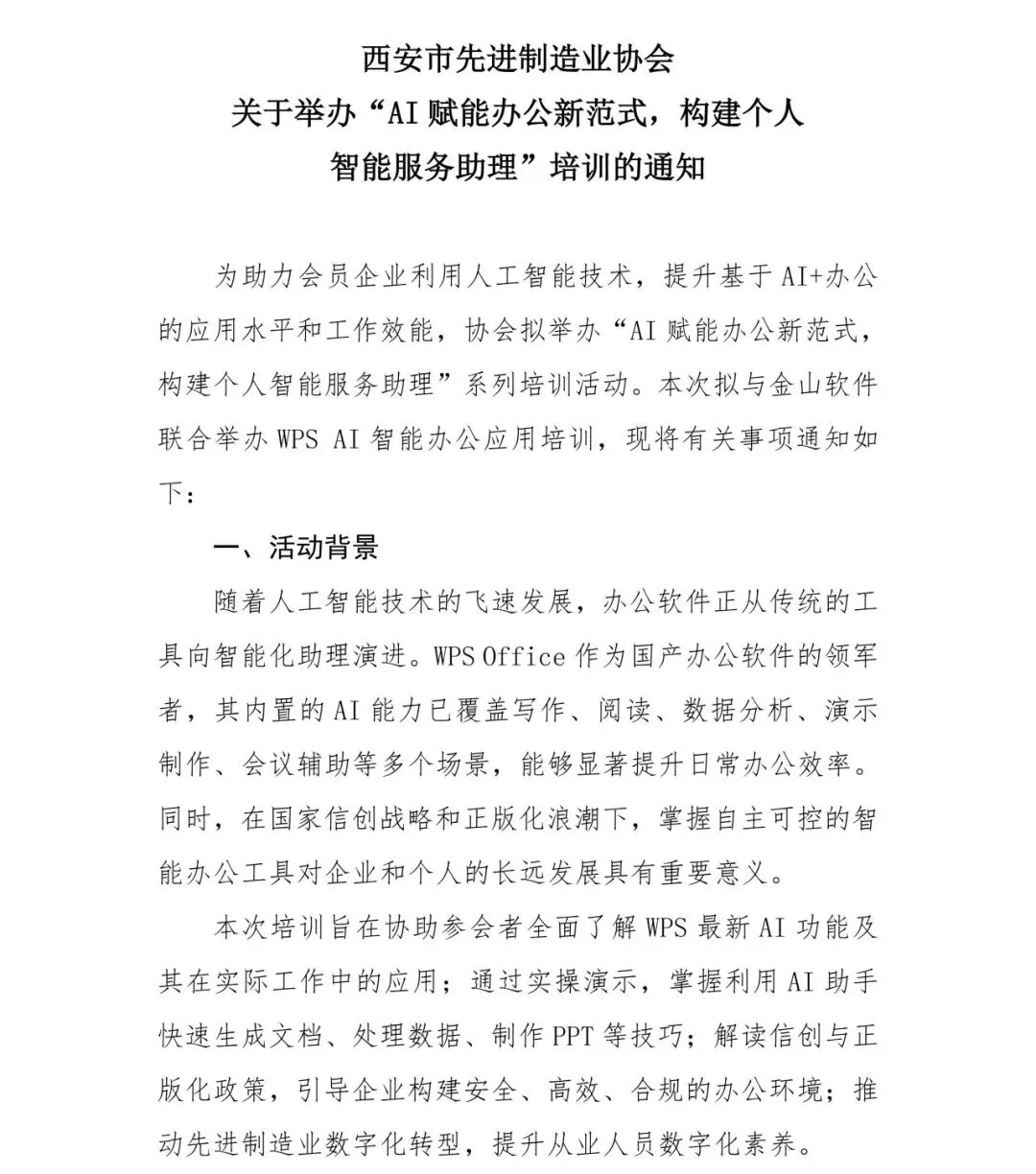 活动邀约 | 西安市先进制造业协会《WPS AI智能办公应用培训》活动邀约