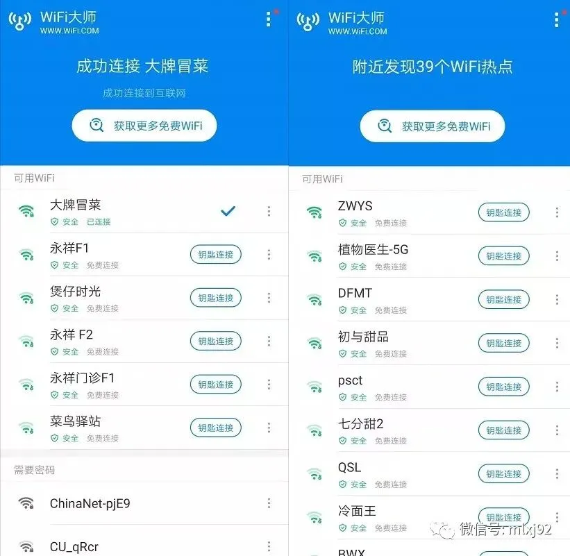 可用WiFi,直接点击钥匙连接,它会直接帮我们连接上。不需要我们知道密码,是不是很方面。