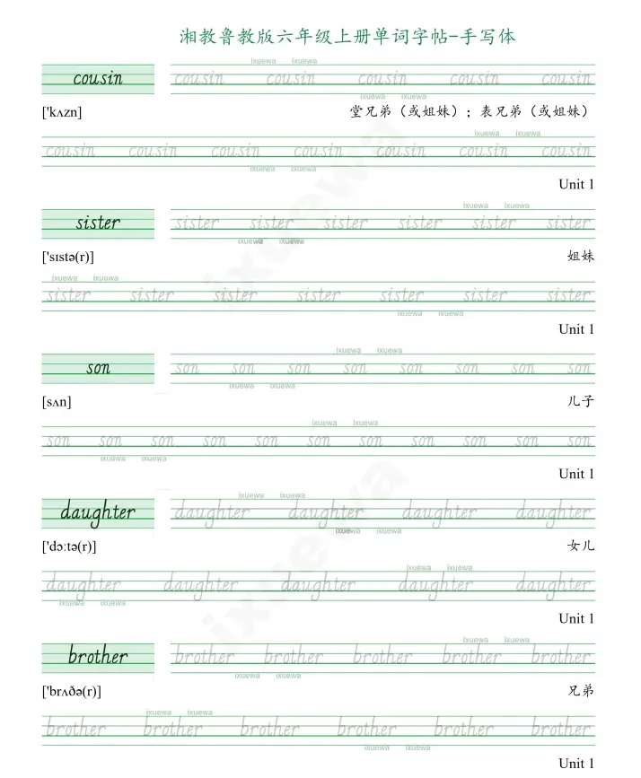 湘教鲁教版六年级上册英语单词字帖根据2024年秋季教材单词排版,采用浅色描红排版,增加单词音标,可以一边练习书写一边拼读单词,加深印象。字帖可以配合默写纸使用,更好记忆单词。高清打印版下载见文章末尾。