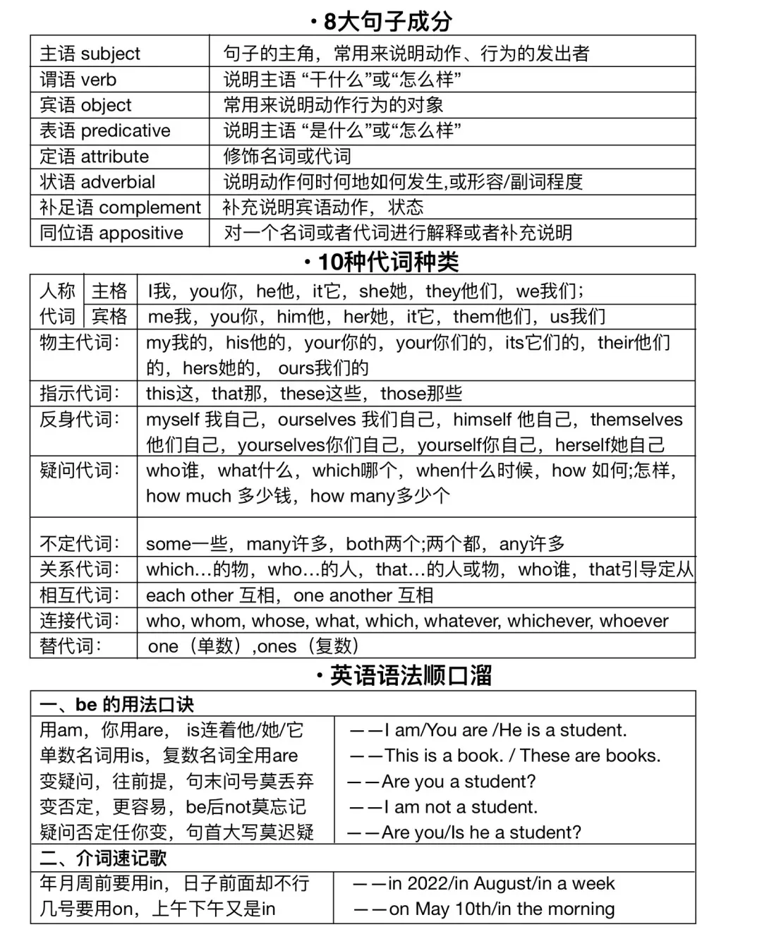 十种基本词性 1. 名词:名词是用于指代人、物、地点以及抽象概念的词语。例如:Smith(史密斯)、apple(苹果)、pear(梨)、grape(葡萄)、China(中国)、Japan(日本)。名词的主要语法特点包括单数和复数形式的变化、名词所有格、集合名词的使用以及在句子中与动词保持主谓一致。 2. 动词:动词用来表达动作或状态。例如:look(看)、cry(哭)、smile(微笑)、run(跑)、jump(跳)、make(制作)、build(建造)、hold(持有)。动词的重要语法结构包括be动词、情态动词、及物动词与不及物动词的区别、助动词的运用、系动词、实义动词的概念、被动语态的构建、主谓一致规则以及动名词和分词的形式。 3. 形容词:形容词用以修饰名词,描绘人或事物的特性或特征。例如:good(好的)、green(绿色的)、beautiful(美丽的)、tall(高的)、heavy(重的)、slim(苗条的)、pink(粉色的)。形容词的主要语法要点为比较级和最高级的形成,以及某些形容词与副词形式相同的现象。 4. 冠词:冠词位于名词之前,起到限定其意义的作用,不能单独使用。主要包括定冠词a/an/the。冠词的重要语法知识点包括定冠词、不定冠词的选用以及特定情况下不使用冠词(零冠词)的情况。 5. 副词:副词主要修饰动词、形容词或其他副词,用来描述动作的时间、地点、程度等特性。例如:quickly(快速地)、now(现在)、luckily(幸运地)、truly(真正地)、possibly(可能地)、terribly(非常地)。副词的关键语法点涵盖了时间副词、频率副词、方式副词、程度副词以及其他类型的副词。 6. 数词:数词用来表示数量或顺序。例如:one(一)、ten(十)、twenty-first(第二十一)、second(第二)、third(第三)、five(五)、twelve(十二)。数词的语法结构包括基数词、序数词以及如何正确表达年份、日期、小数、分数等。 7. 介词:介词通常置于名词或代词之前,表明它们与其他词汇之间的关系。例如:on(在…上)、by(通过)、in(在…里)、to(到)、across(穿过)、beside(在旁边)、behind(在后面)、between(在两者之间)。介词的主要语法内容涉及地点介词、方向介词、时间介词、方式介词以及其他相关介词的使用。 8. 感叹词:感叹词独立于句子结构之外,用于表达强烈的情感或情绪变化。例如:oh(哦)、dear(亲爱的)、well(好)、why(为什么)、my god(天哪)、Good Lord(上帝啊)。 9. 连词:连词用于连接词、短语或句子,建立它们之间的逻辑联系。例如:and(和)、before(在…之前)、as well as(也)、both…and…(两者都)、neither…nor…(既不…也不…)。连词的语法要点包括并列连词、从属连词以及表达转折、因果等各种逻辑关系的连词。 10. 代词:代词用来代替或指代人或事物,避免重复。例如:I(我)、his(他的)、this(这个)、myself(我自己)、you(你)、them(他们)、ourselves(我们自己)。代词的主要语法分类有:人称代词、物主代词、反身代词以及指示代词等。