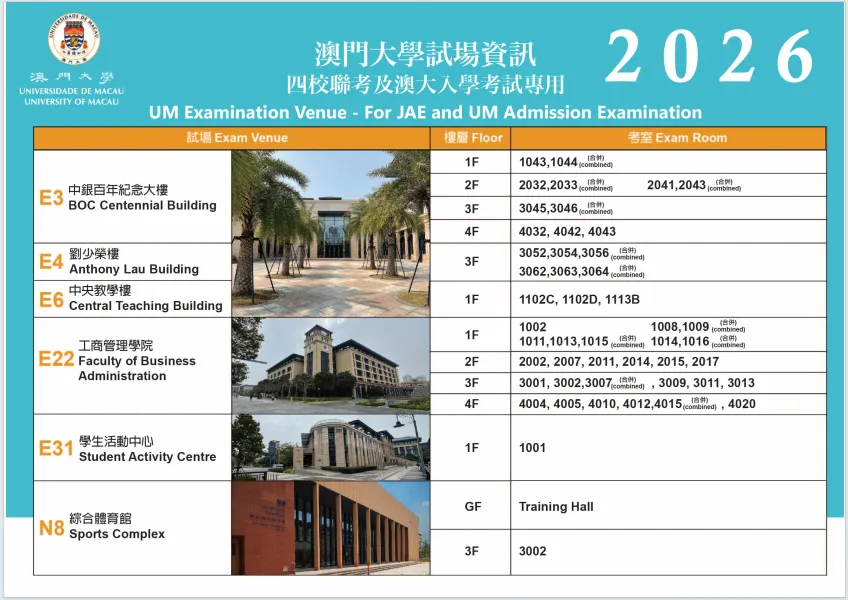 • 考生可登录本校注册处“澳门四校联合入学考试”专页查询考场信息。