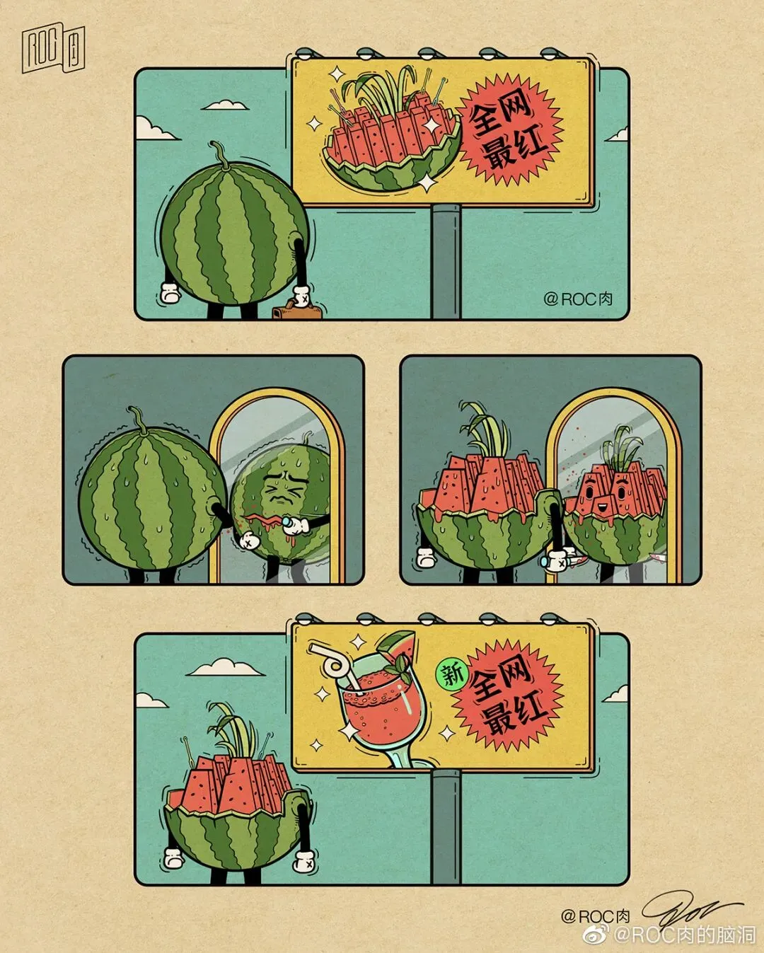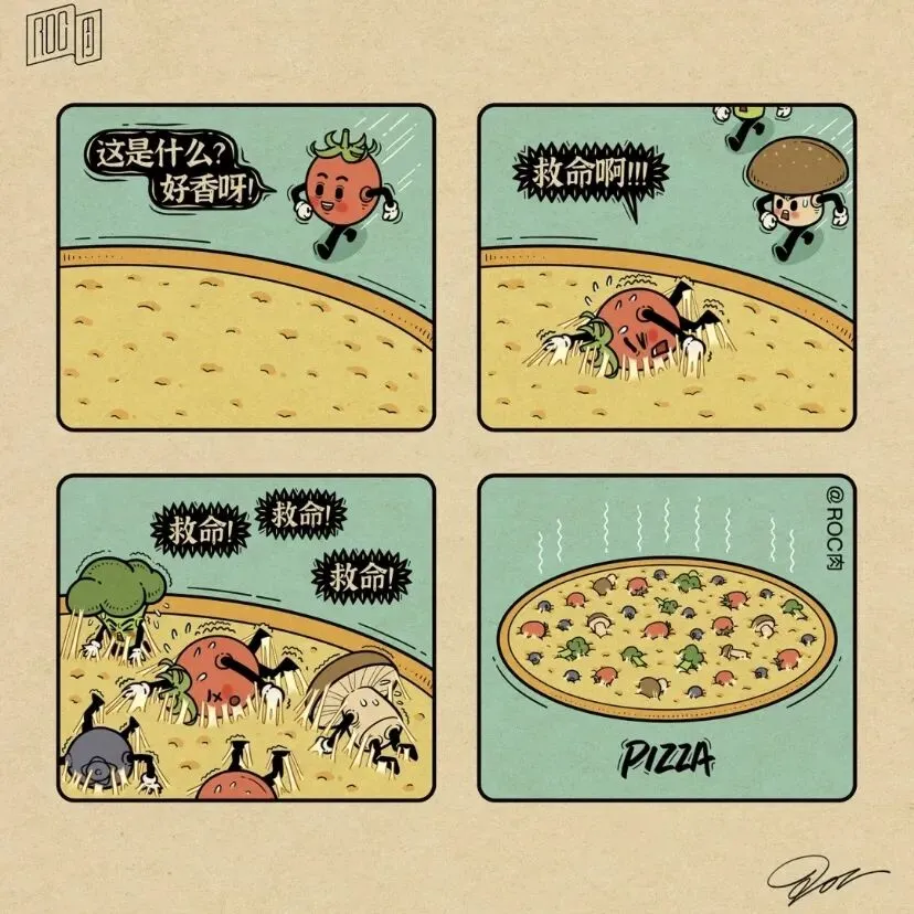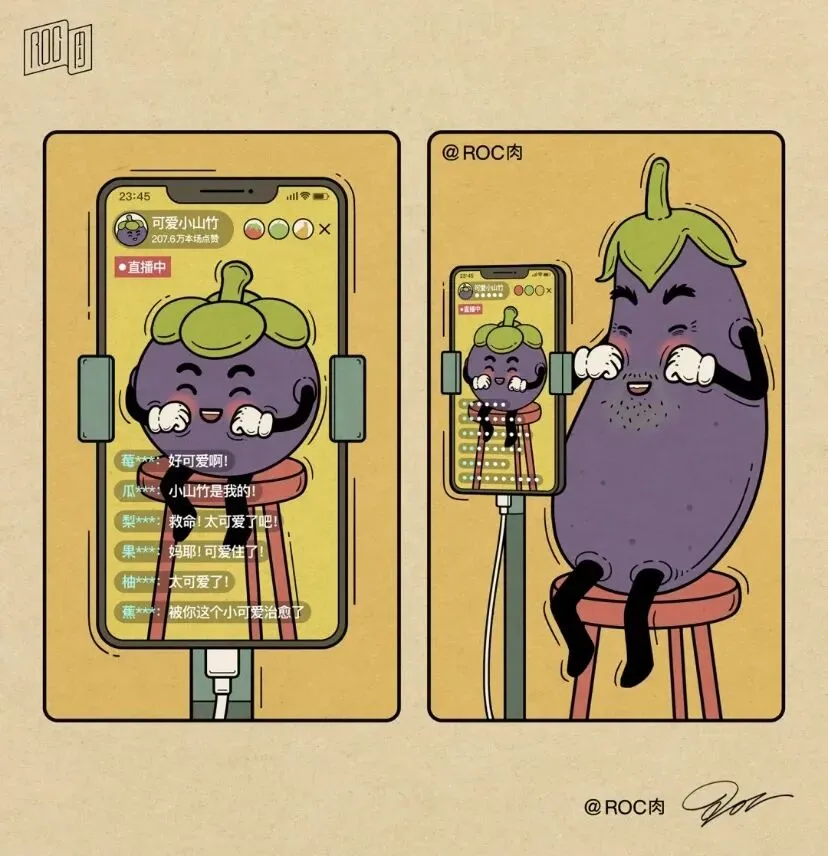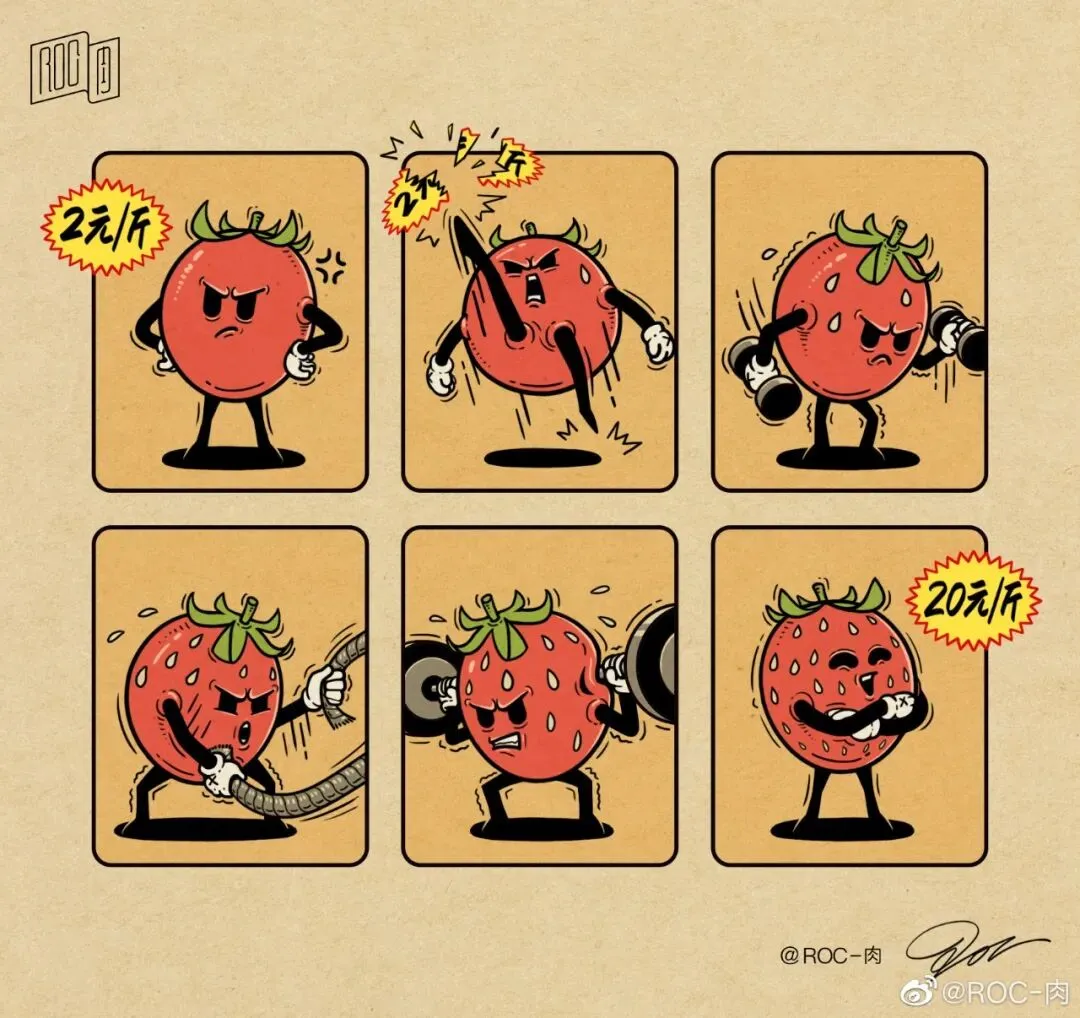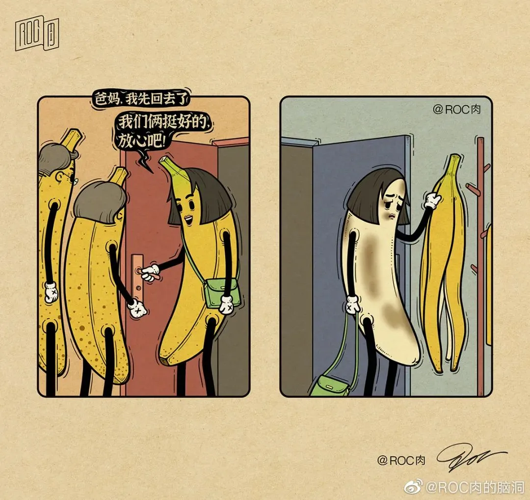 他把创作视角定位到日常场景,漫画中不止有我们常见的瓜果蔬菜和生活用品,还有以女朋友为原型的人物。通过个性化的趣味展示,将当代普通人的真实日常(扎心)描绘出来,引起大家的内心共鸣。