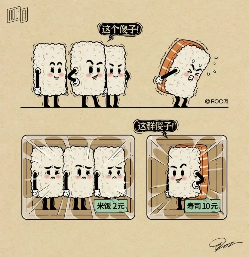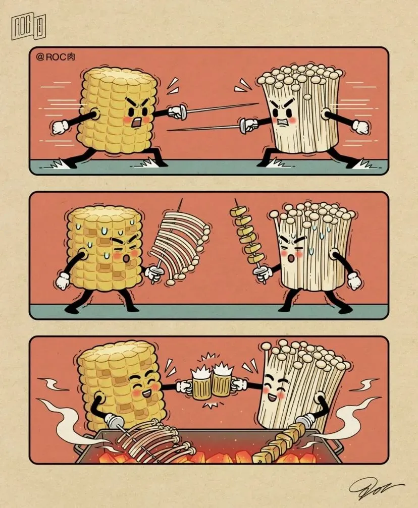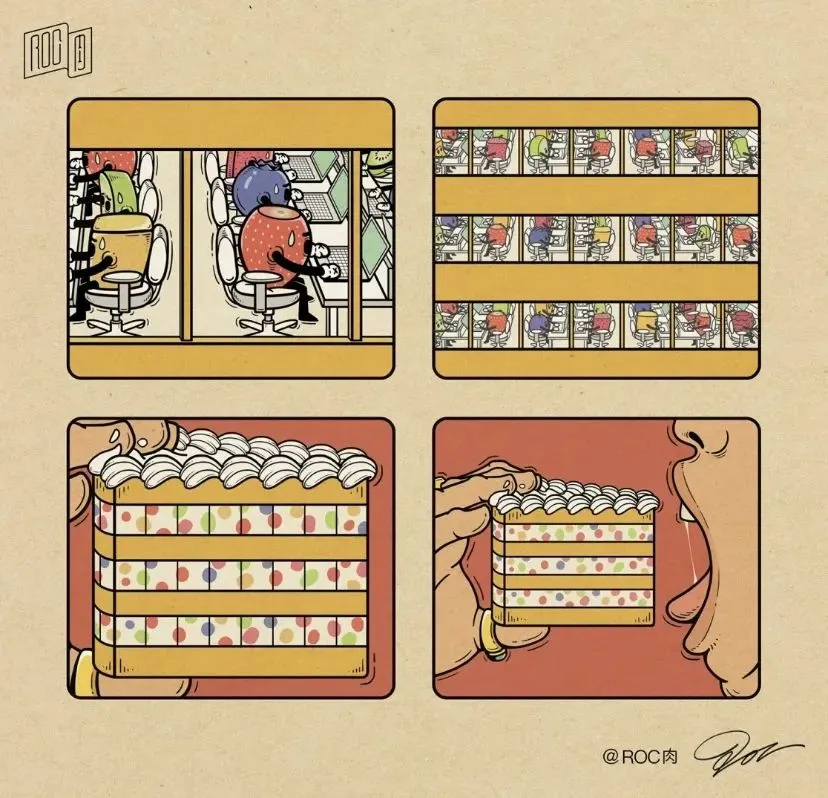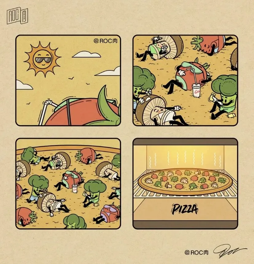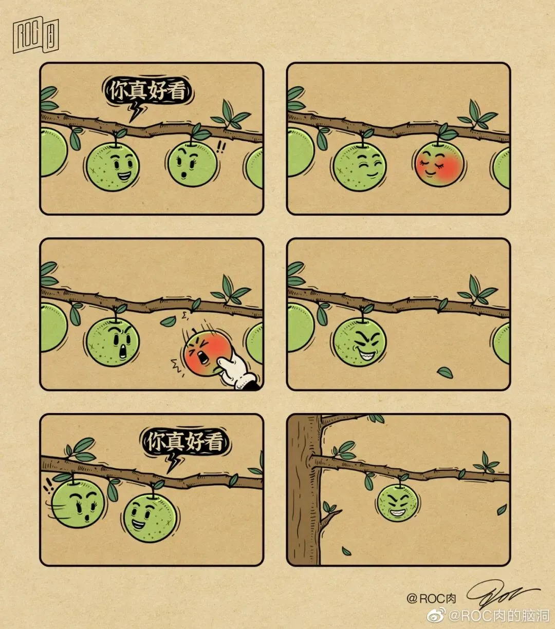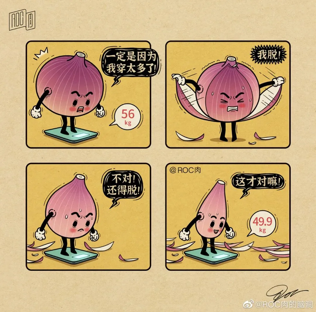 他把创作视角定位到日常场景,漫画中不止有我们常见的瓜果蔬菜和生活用品,还有以女朋友为原型的人物。通过个性化的趣味展示,将当代普通人的真实日常(扎心)描绘出来,引起大家的内心共鸣。