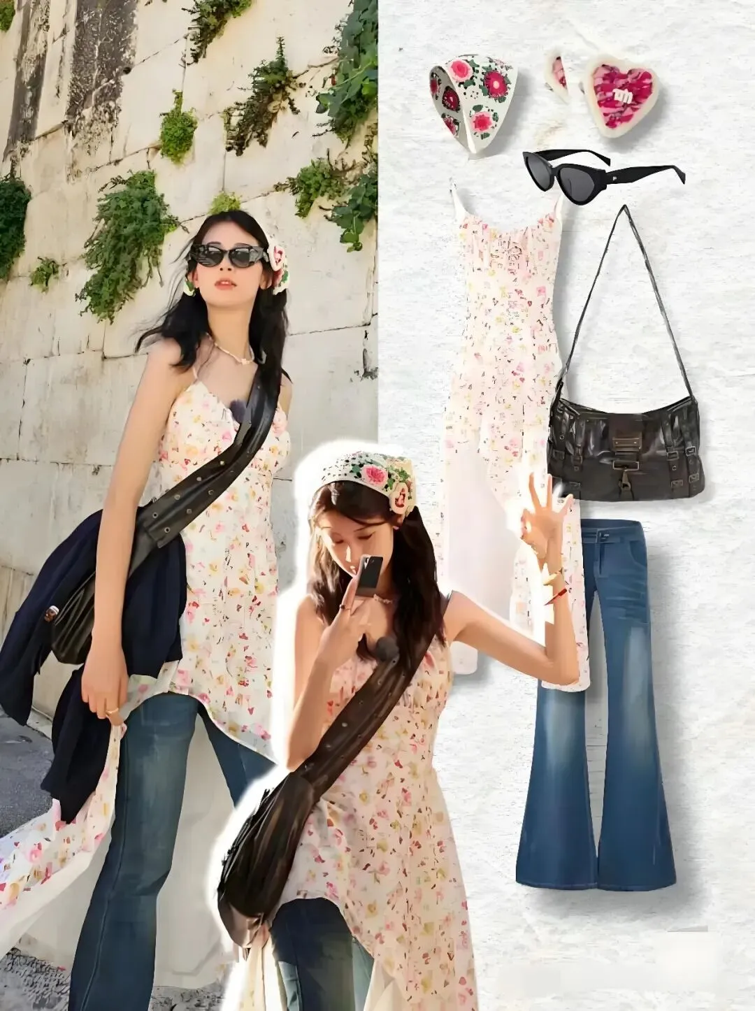2023年10月,旅行综艺《花儿与少年》开播,女明星赵昭仪在节目中的穿搭火出圈,不仅掀起了不规则吊带裙叠穿牛仔裤的风潮,这种宛如打翻颜料盘的穿衣风格,还被不少95后、00后少女竞相效仿,被评为“一眼艺术生的风格”。而三角巾正是其最热衷的时尚单品。