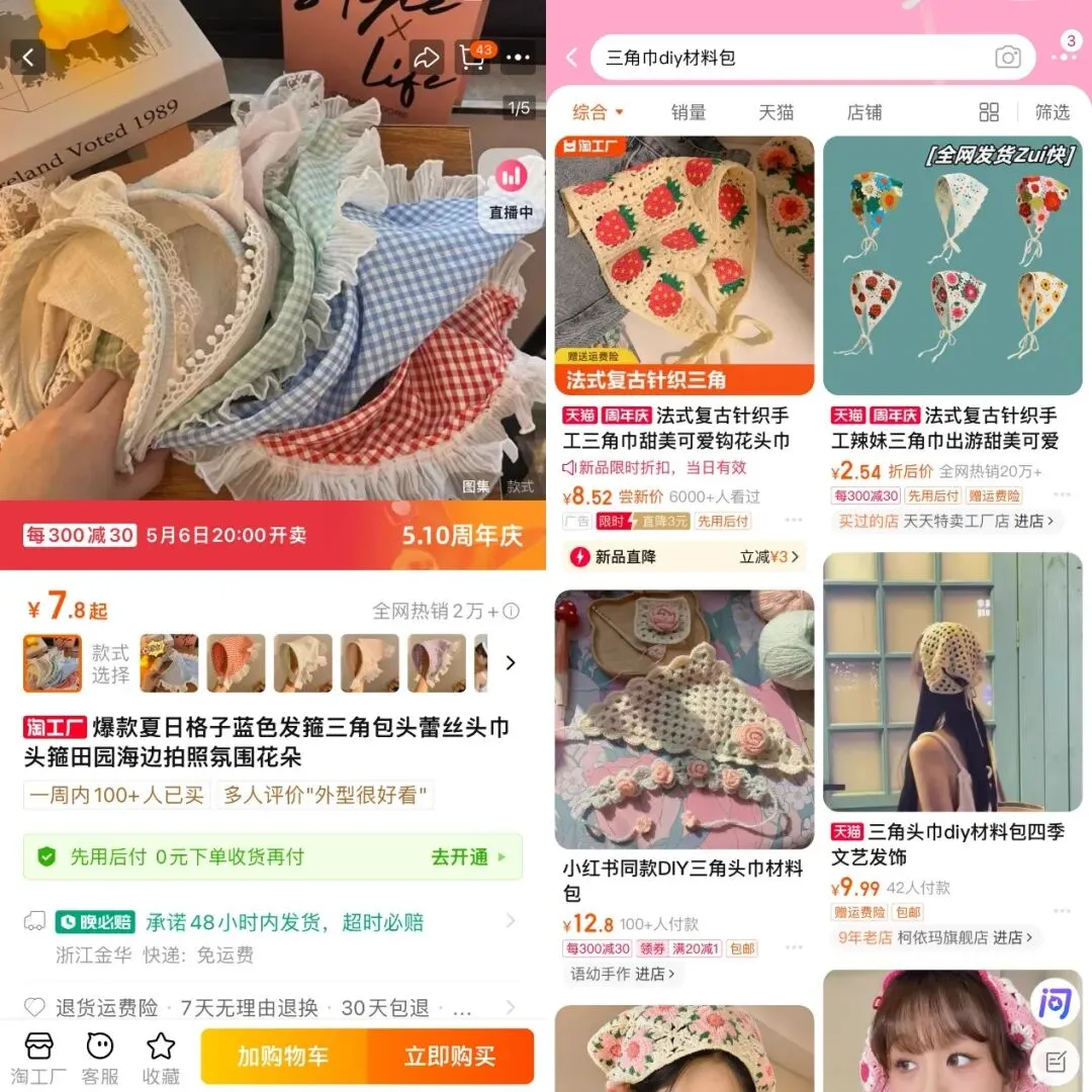 而三角巾火了之后,一些升级款式也在市场上涌现。比如今年以来,“编织热”带火了编织针钩款的三角巾,部分偏爱手工的年轻人开始购入“三角巾DIY材料包”,卖材料包的商家也开始月销千单;留意到不少女孩不擅长佩戴三角巾,戴上秒变“狼外婆”的现象后,一种和头箍结合的三角巾受到了青睐,天天特卖工厂店的三角巾头箍已经月销超过20000件。