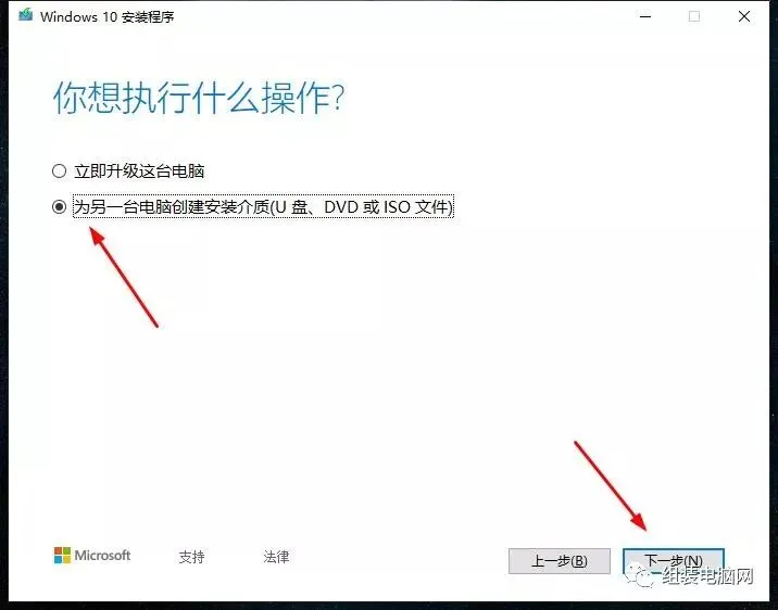 3、选择第二项为另一台电脑创建安装介质(U盘、DVD或IOS文件)点击下一步。