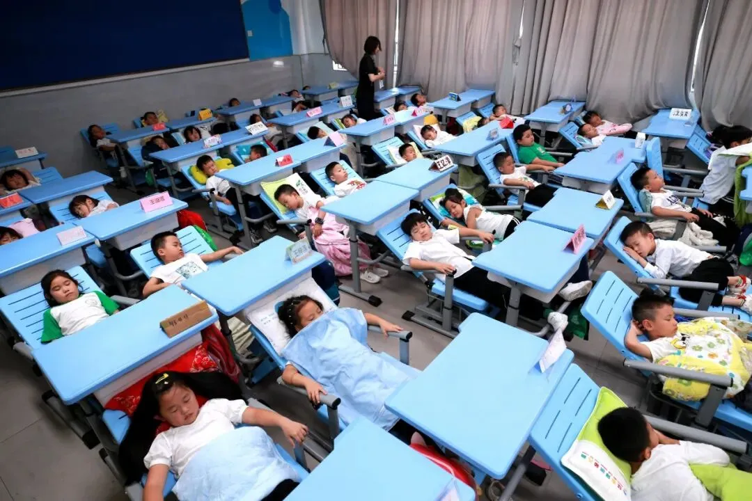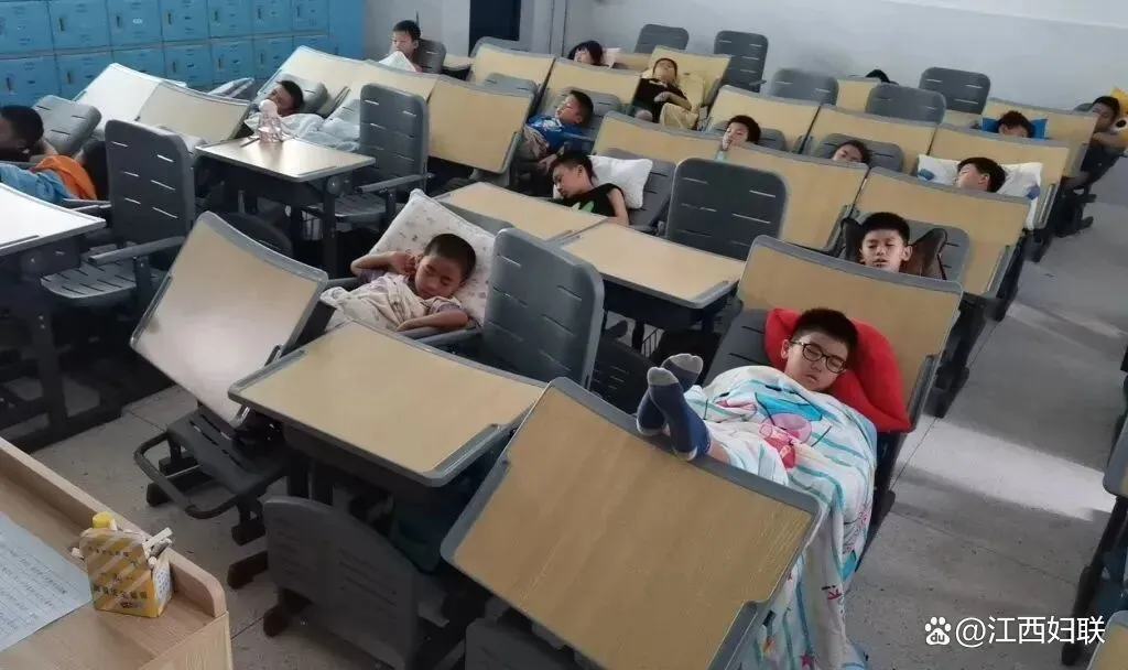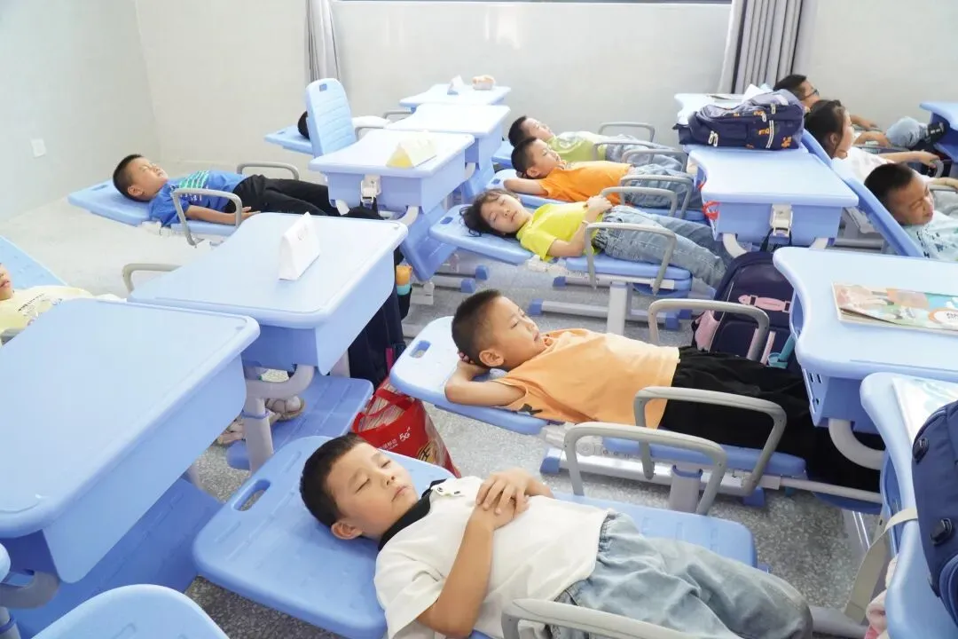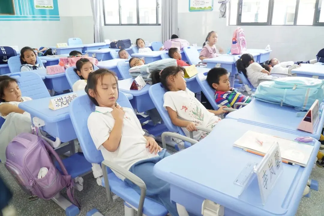 很多学校由于场地、设施受限,午休时,孩子只能趴在课桌上睡,而趴着睡觉的午休方式对孩子骨骼、颈椎、脊柱等发育都会有影响。新余市渝水区的松山小学以人为本,大力落实“双减”工作。为保障孩子充足的睡眠时间,改善午睡质量,提高下午的学习效率,促进全面健康成长,学校准备了可以躺着睡的桌椅,让孩子们在学校就可以安心地睡个午觉。