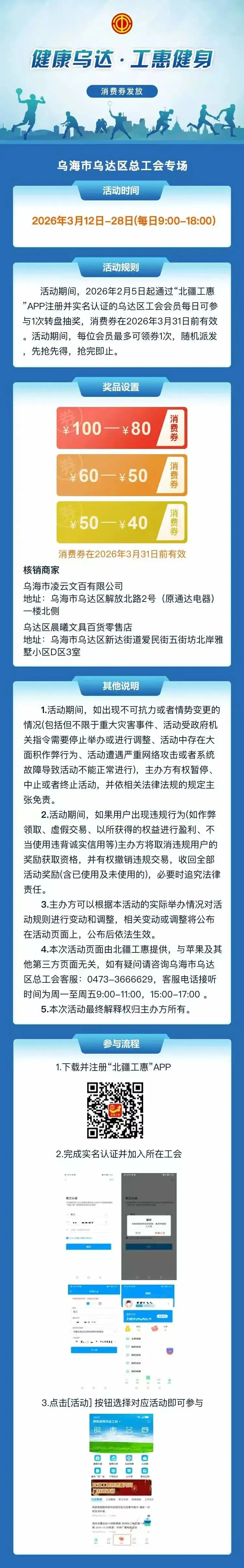 本文最后更新于2026-03-11,某些文章具有时效性,若有错误或已失效,请在下方留言或联系老夜。 动起来!乌达健身消费券,北疆工惠APP在线领~ 乌达区总工会 撰稿:周文婷 初审:杨 冬 二审:张 芃 终审:张振国