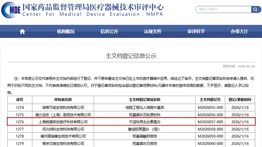 近日,上海锐捷荣创医疗科技有限公司(REGE MedTech) 自主研发的医用级丝素蛋白原材料正式完成国家药品监督管理局医疗器械技术审评中心(CMDE)主文档备案!