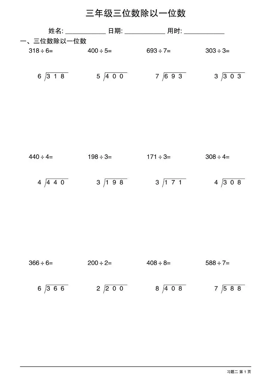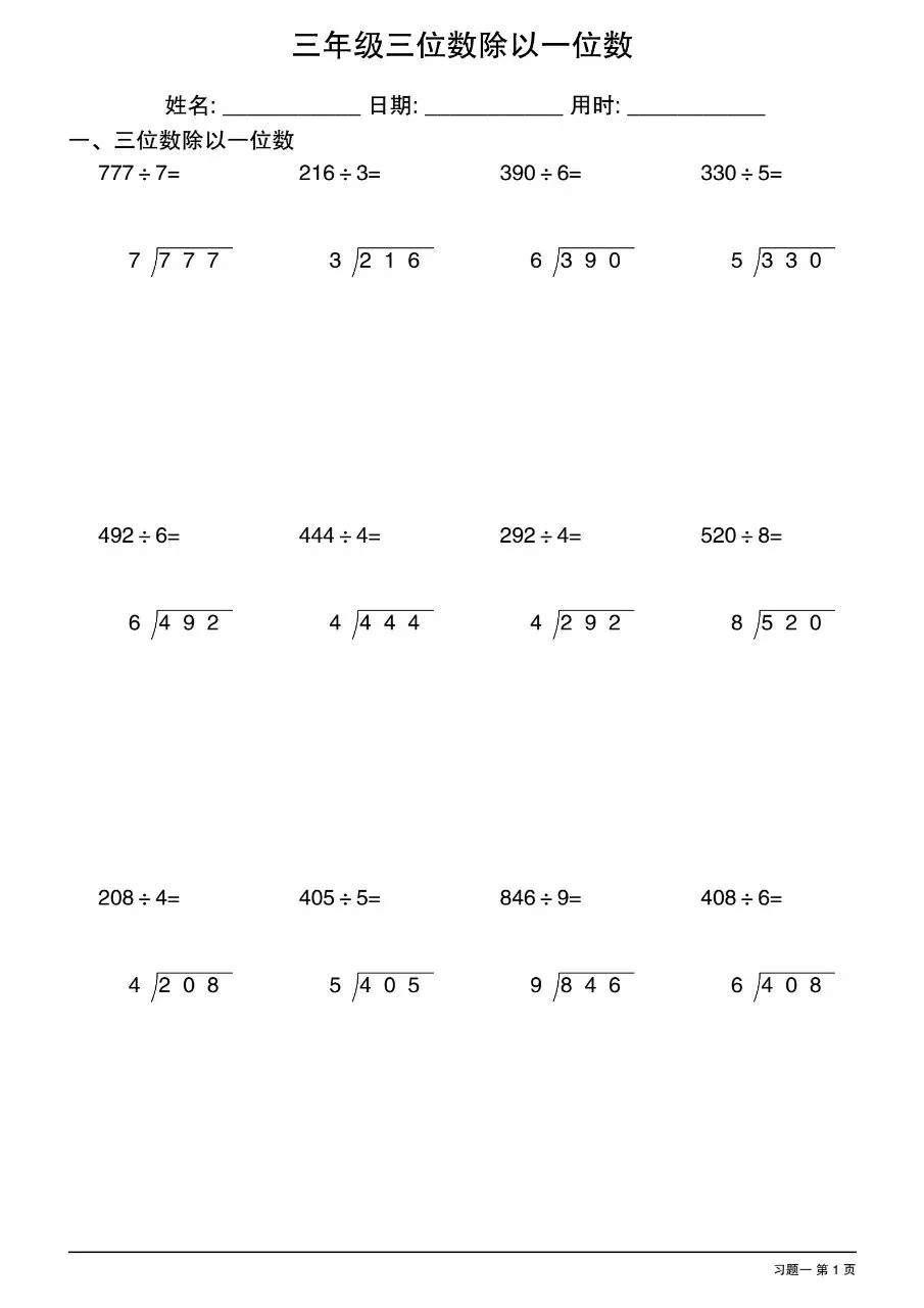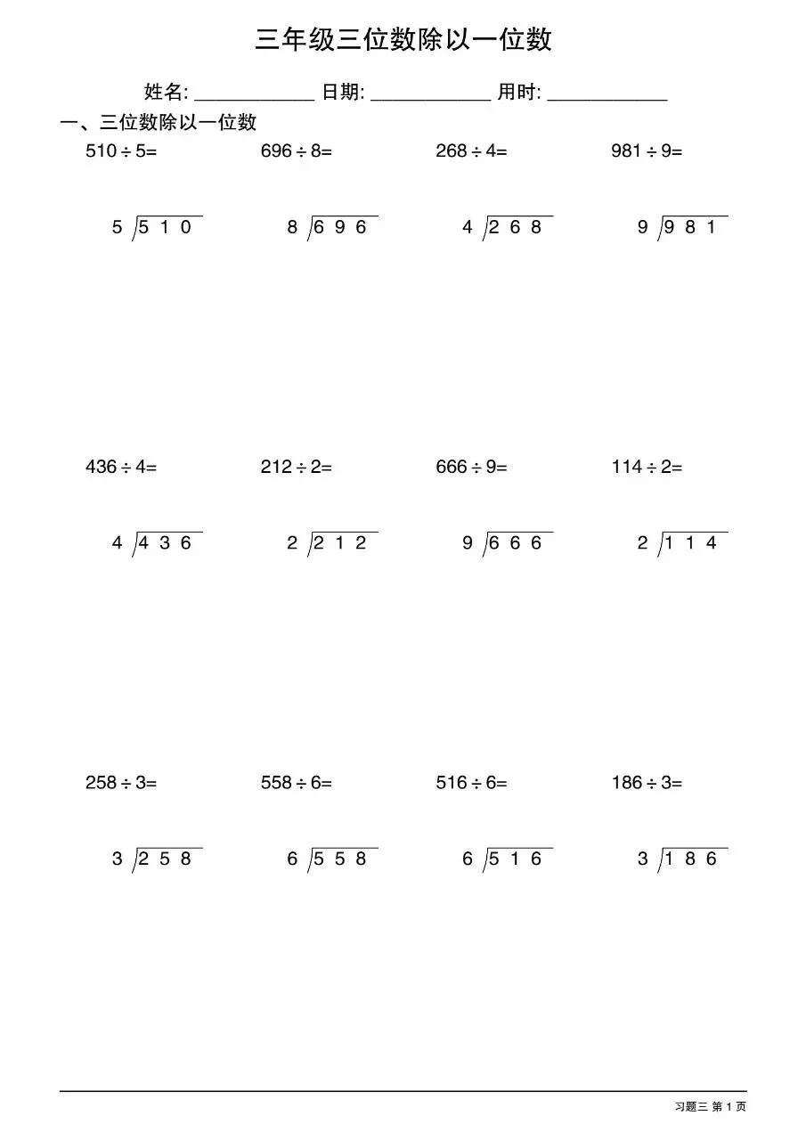 三年级下数学三位数除以一位数竖式电子版免费下载!