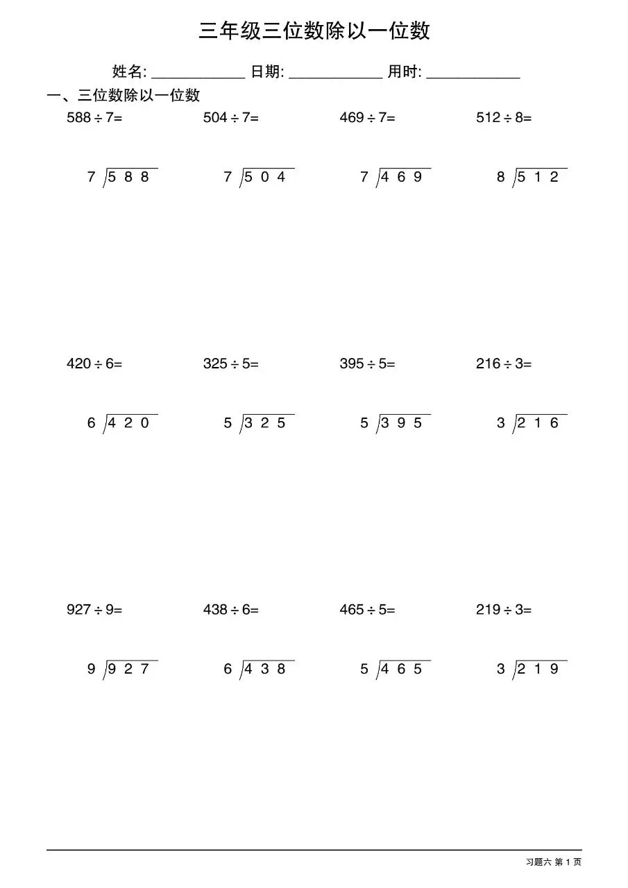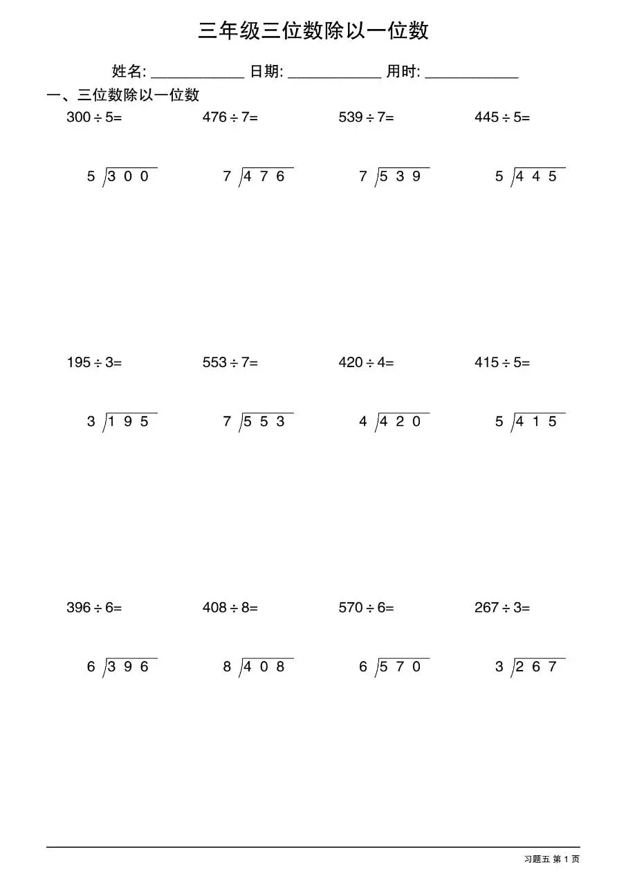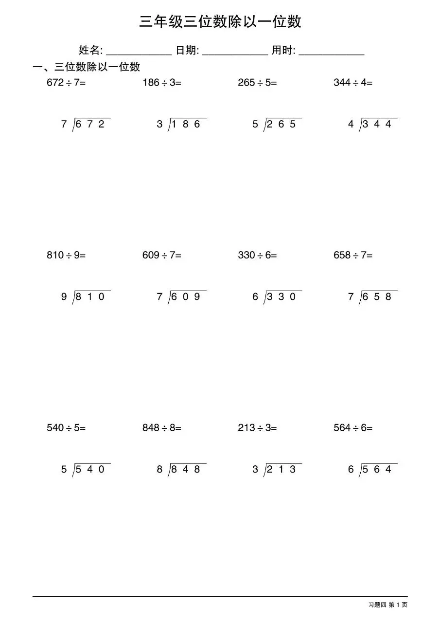 三年级下数学三位数除以一位数竖式电子版免费下载!