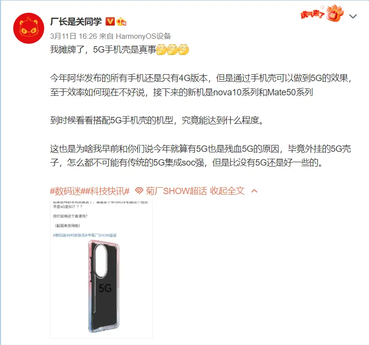 据博主@厂长是关同学爆料:今年华为发布的所有手机还是只有4G版本。但是通过手机壳可以做到5G的效果,至于效率如何,现在不好说,其还透露接下来的新机是nova10系列和Mate50系列。目前,这种说法尚未得到华为官方证实。有网友分析,这个技术类似于以前的“苹果皮”,给iPod Touch带上“苹果皮”后,就能跟iPhone一样打电话了。