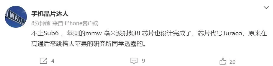 据业内人士@手机晶片达人爆料,一位从高通跳槽至苹果的内部人士透露,不止Sub-6GHz,苹果的mmWave毫米波射频RF芯片也已完成设计,代号Turaco。今年1月,有消息称苹果自研5G基带及配套射频芯片完成设计,开始试产及送样。