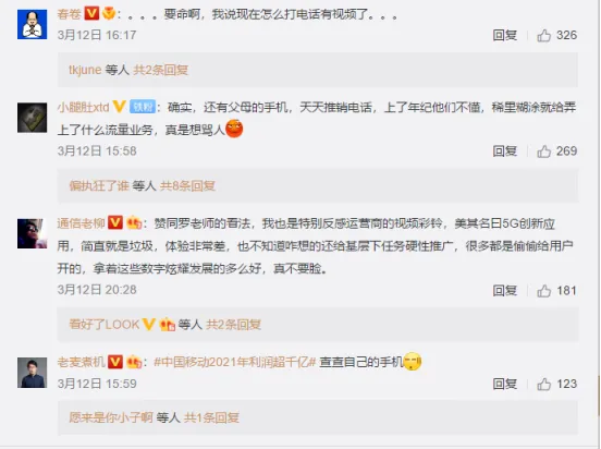 3月12日,锤子科技创始人罗永浩在微博上对视频彩铃业务表达了两方面的不满,一方面是私自开通,自动扣费,涉嫌霸王条款;另一方面,他认为视频彩铃对用户也是一种折磨:大部分是恶俗的音乐;电话被接听前不能静音;有时还带广告。此举也引起了大量网友支持,并称感同身受。据悉,视频彩铃是三大运营商在5G时代大力推广的特色业务,将原来的音乐彩铃升级为视频彩铃,当用户拨打语音电话或视频电话时,在呼叫接通前会看到的一段视频内容就叫 “视频彩铃”。