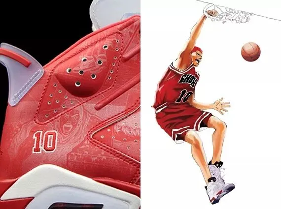 以樱木花道的(30日元买来的)第一双篮球鞋Air Jordan 6为基底,加上湘北篮球队经典的红加白配色, 引起一波抢购热潮。
