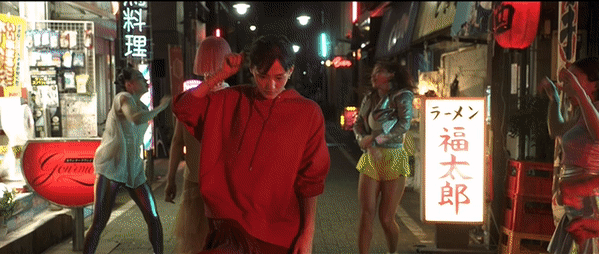 身穿黑衣的窦靖童,掌心之下是传统黑白风的漫画元素。再加上周围伴舞的衬托,超级符合她酷girl的风格。