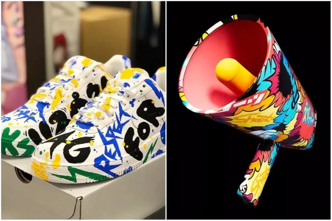 他的作品中充斥着大量的街头风格,仔细一看还有不少对话框、拟声词这样的动漫和漫画元素。