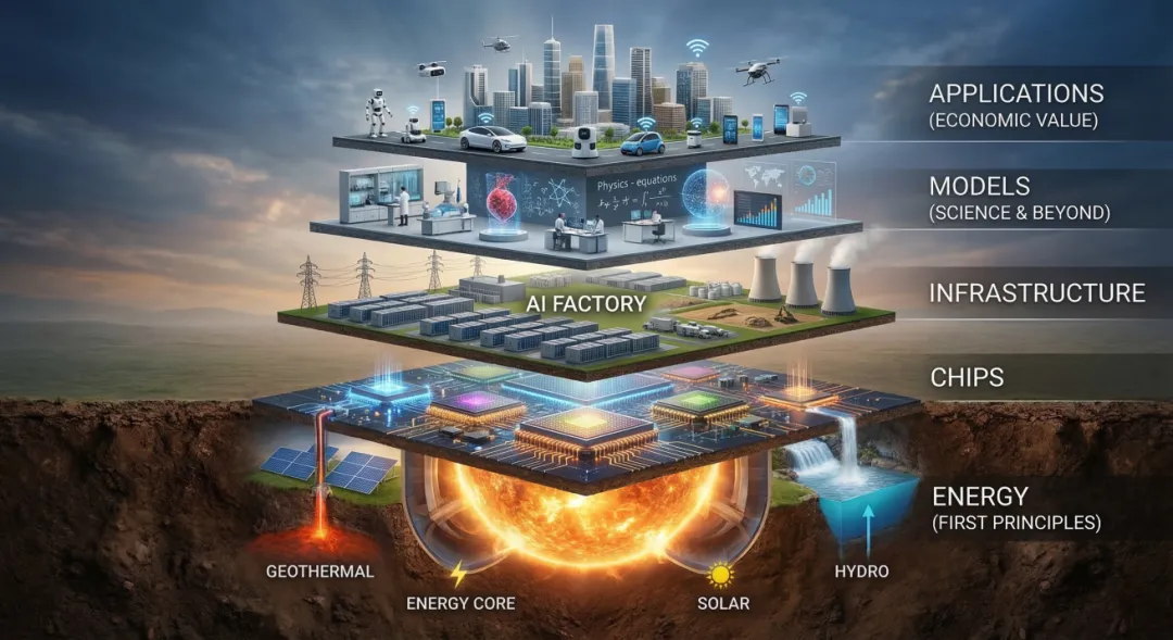 第三层为基础设施,被定义为“AI工厂”,涵盖土地、电力输送、冷却系统及网络,核心作用是将成千上万台处理器协同调度,实现智能的规模化生产。第四层是覆盖生物学、物理学等多领域的“模型”;最顶层则是直接创造实际经济价值的“应用”。黄仁勋强调,这五大层级形成闭环产业链,任何一个顶层应用的成功,都会产生强劲的向下拉动效应,直接带动底层基础设施及能源需求的爆发。