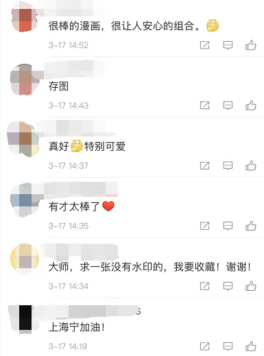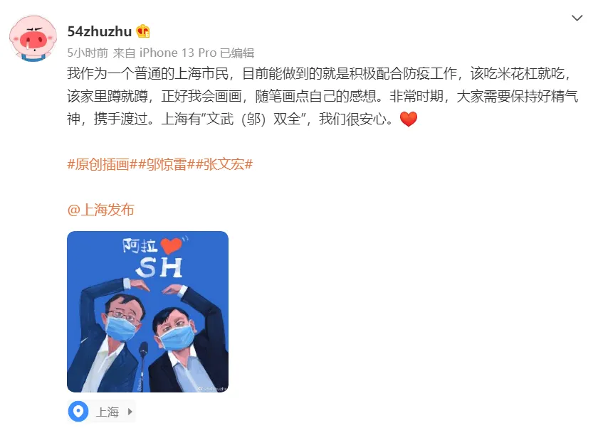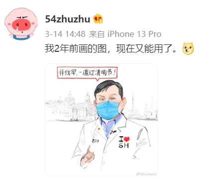 “最开始画邬主任,是因为最近他的出镜频率很高,他一出来就意味着上海有疫情,但一看到他,上海市民就很安心”,在这两种情绪的促使下,他画了第一幅邬主任的插画,没想到走红网络,很多网友留言希望他继续创作。