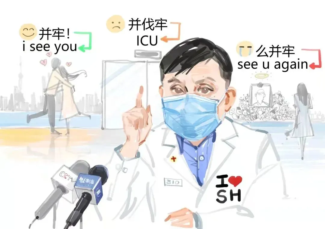 17日上午的上海市新冠疫情防控新闻发布会上,张文宏医生和邬惊雷主任同时出席,二位专家都奋战在上海抗击疫情的一线,这让他有了创作一幅二人合体插画的想法。