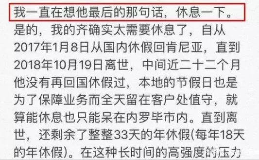 从2017年1月到2018年10月,齐智勇连续22个月一直在国外工作,没有回国休息过一次。即便是当地的节假日,他也全天留在客户处值守。直到去世前,他还有多达33天的年假没休