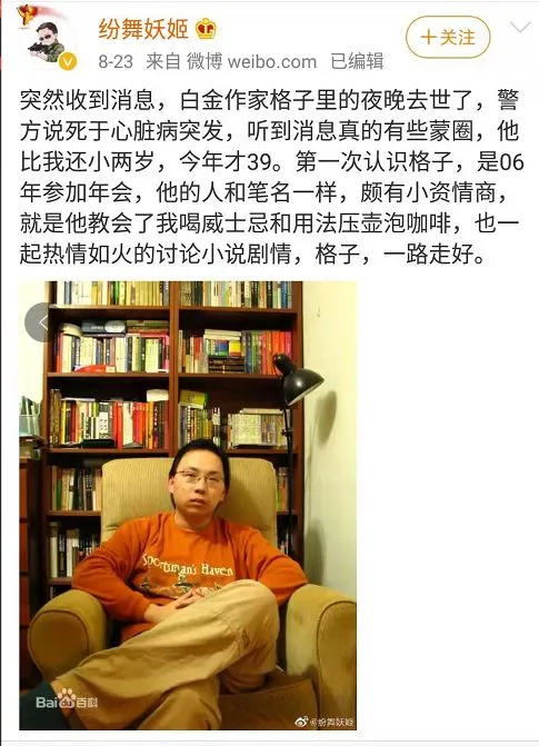 今年8月,网络文学著名作家、阅文大神作家“格子里的夜晚”,因突发心脏病去世,因独居家中,十天后才被发现。