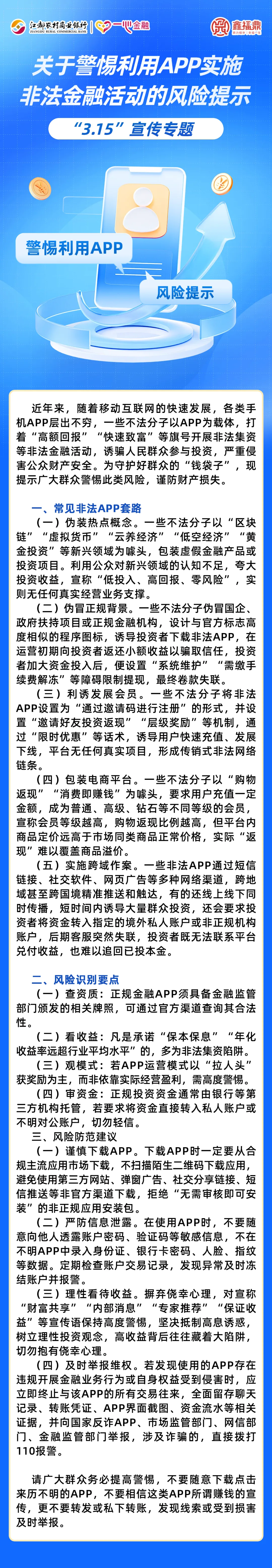 “3.15”宣传专题 | 关于警惕利用APP实施非法金融活动的风险提示 *文章来源:网络。本微信的主要目的在于分享信息,让您了解更多的资讯。如有侵权或违规请联系告之,将在规定时间内给予删除处理。 -END-