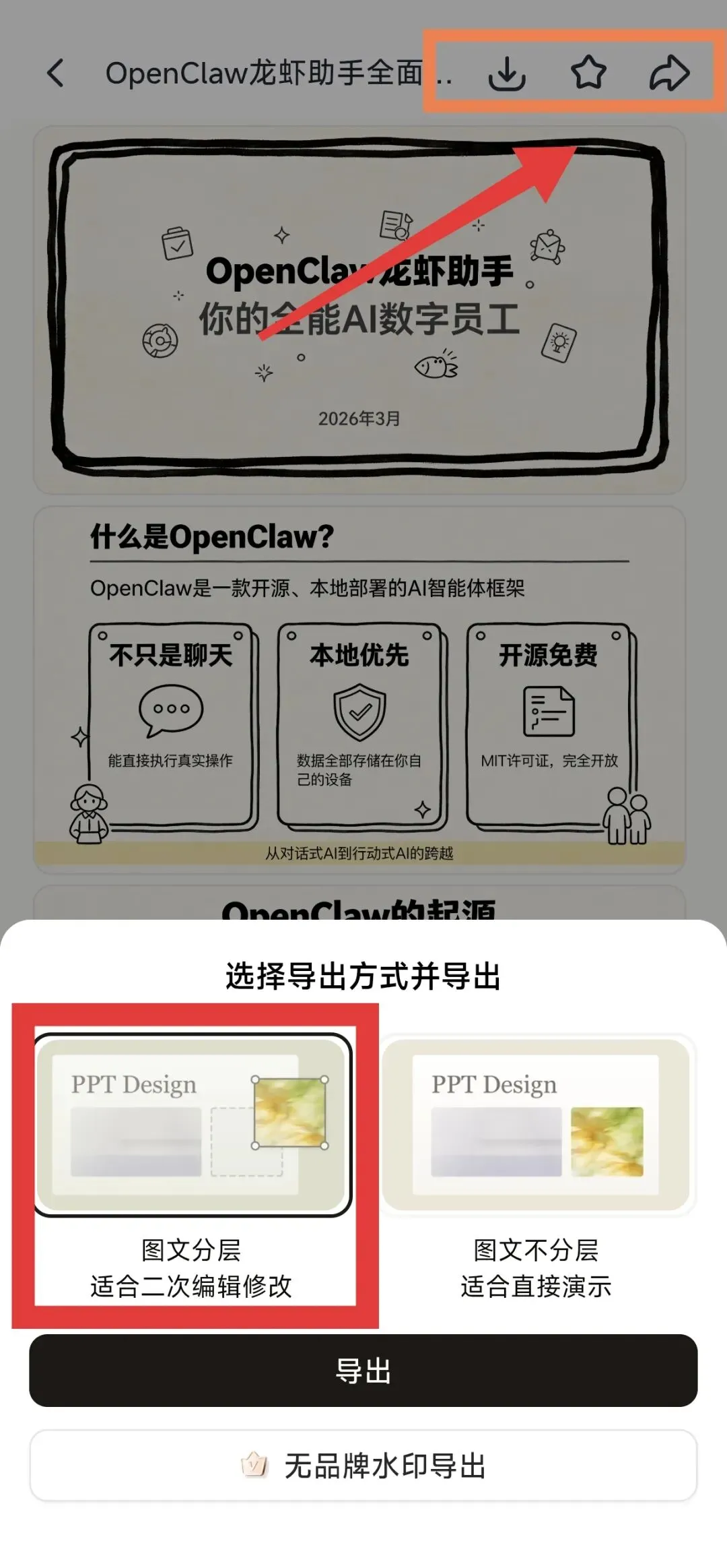 在这里我们选择导出的方式为“图文分层”,这样的话我们可以在本地进行二次修改与创作。