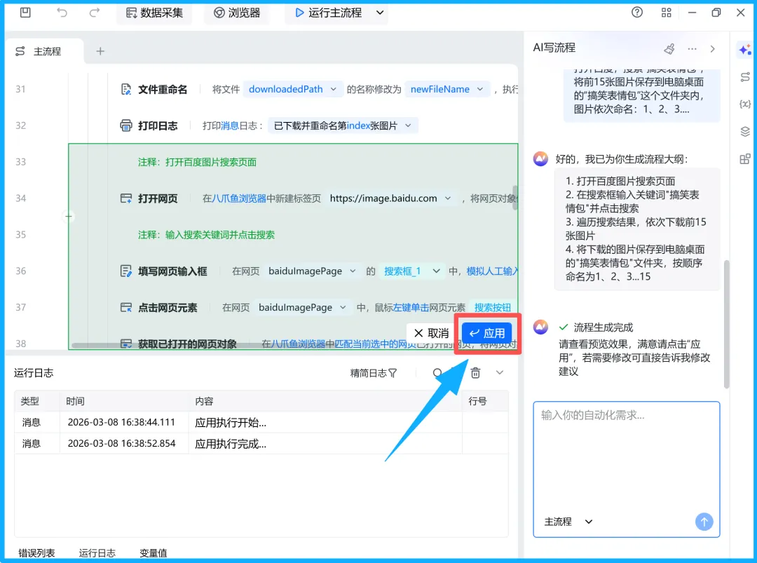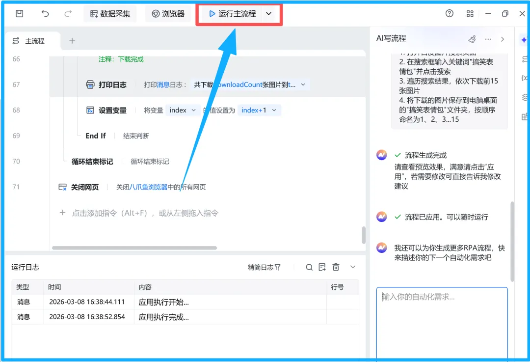 提需求给八爪鱼PRA后,直接点击运行主程序,可以看到从搭建流程到执行完成,全程可视化追踪,每一步操作细节都清晰可查,既保证了准确性,又无需用户关注技术细节。