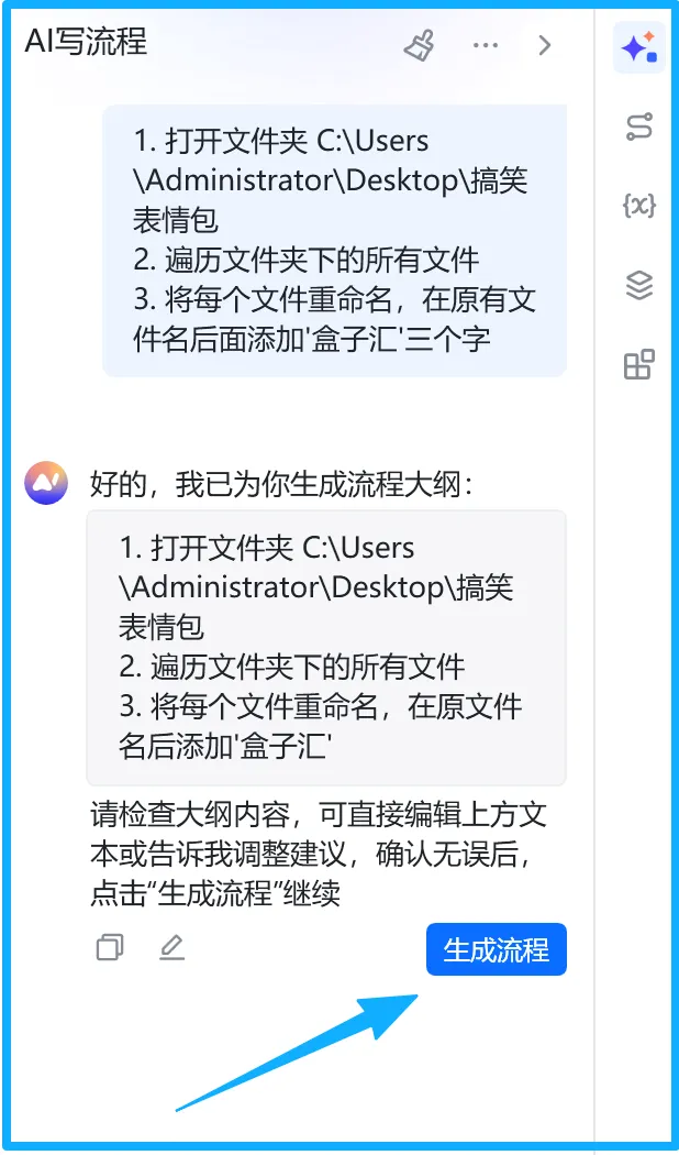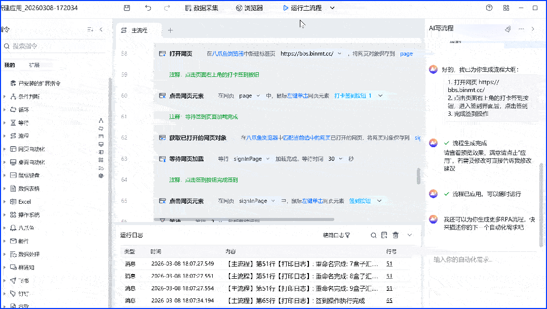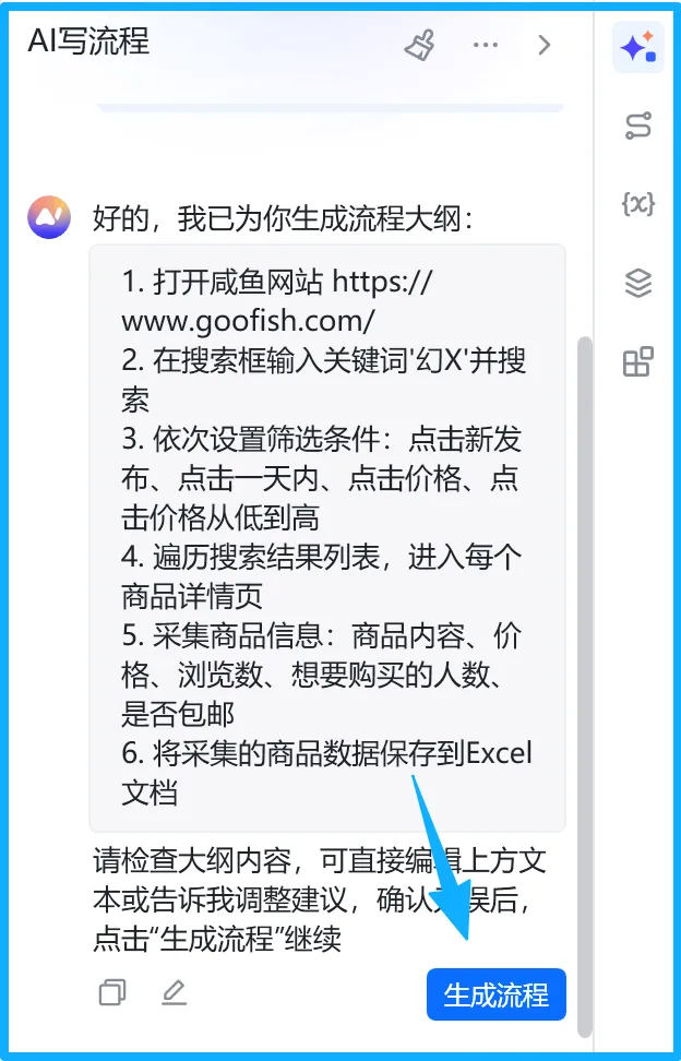 八爪鱼 RPA 的 “AI 写流程” 堪称王炸级功能。不用学习复杂指令,不用拖拽拼接繁琐步骤,只需用中文清晰描述需求,AI 就能自动生成完整流程大纲,预演验证后一键运行。