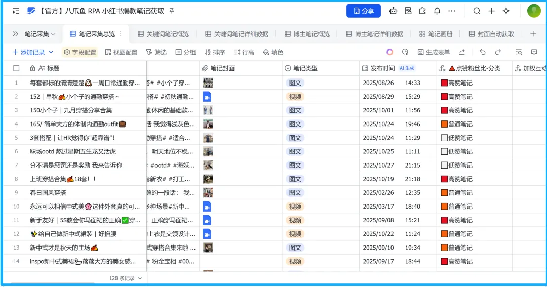 做小红书账号的自媒体人,用八爪鱼 RPA就能实现全天候监控爆款笔记。只需要输入关键词或粘贴对标博主主页链接,它就会自动抓取爆款文案、选题、数据与笔记内容,帮你实时跟上赛道趋势,不用再手动刷主页、记灵感、蹲热点。
