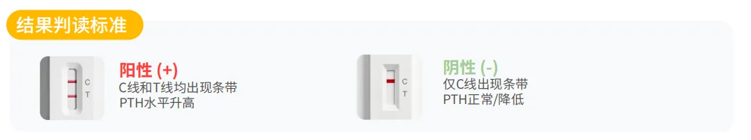 结果判读:15 分钟内判读, C线+T线双带为阳性(甲状旁腺),仅 C 线为阴性(非甲状旁腺),判读标准清晰易懂,可留存客观检测依据。