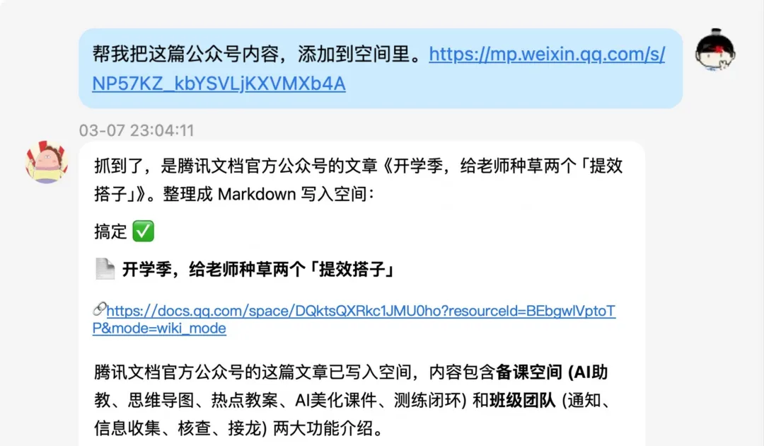 🎉配置成功后,个人用户可通过飞书、QQ等IM消息通道,使唤你的龙虾帮你处理文档啦!比如: