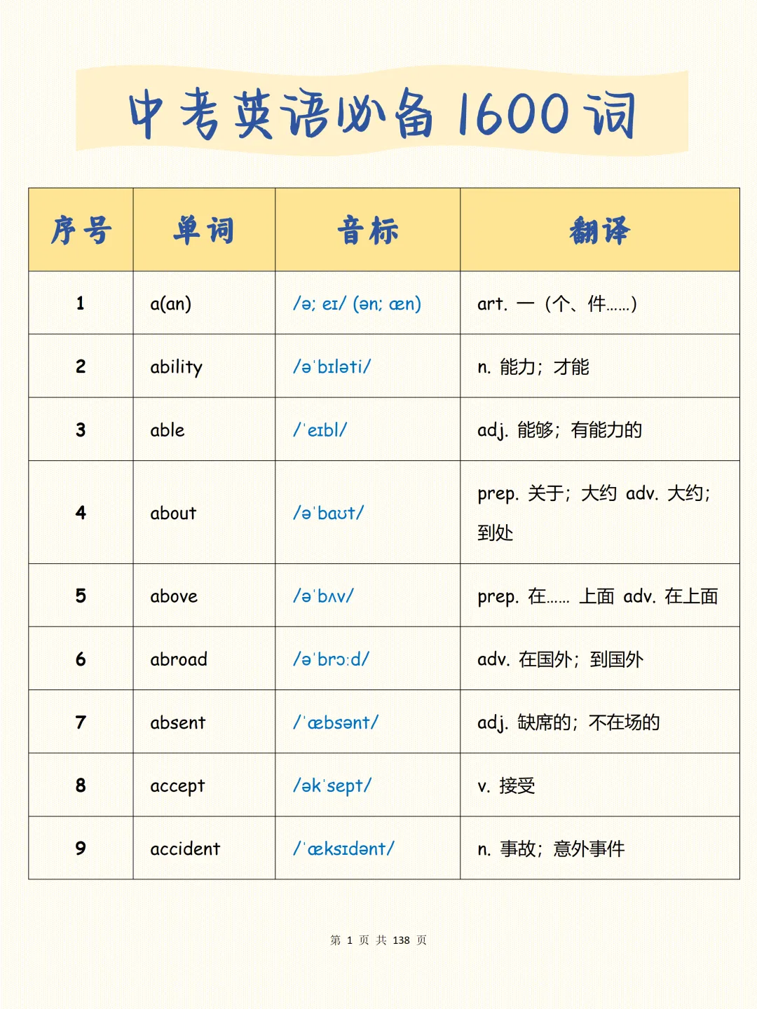 中考必备【中考英语必备1600词】可打印 快收藏 初中英语提分有关键,核心就在“必备1600词”。词汇量是根基,掌握好必备的词,才能在真题解题逻辑中提分。尽管题目多变,核心考点与解题步骤始终不变。 今天给大家整理了中考必备的【初中英语必备1600词】覆盖初一、初二、初三的必备单词。不管题目如何提问,都能精准突破,轻松拿下高分! 因篇幅有限+点这里领取完整版电子资料+ +点这里领取完整版电子资料+