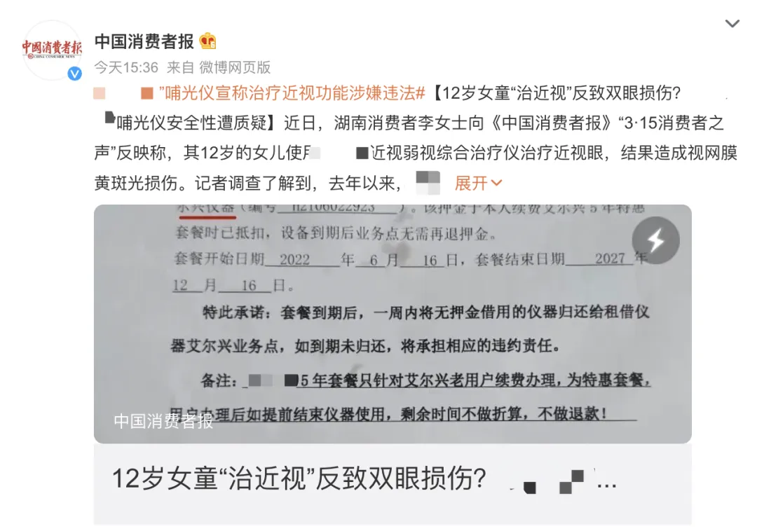 《中国消费者报》就曾报道过典型案例:湖南一名 12 岁女孩,使用某品牌哺光仪治疗近视,仅数月就造成视网膜黄斑光损伤,视力严重受损,这份伤害甚至可能是永久性的。