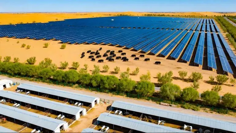 更妙的是,沙地上架起的光伏板,既是“遮阳伞”,又是“充电站”:板下种植的牧草是猪的饲料,板子发的电则能支持监测设备运行。