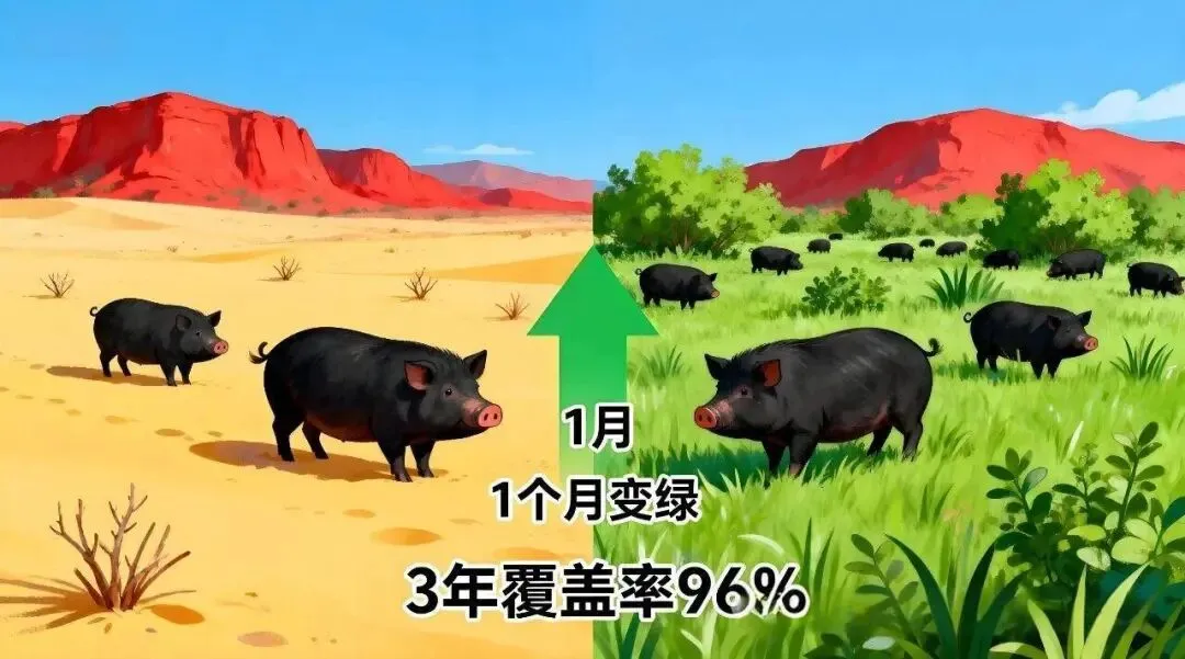 这一套 “采食—排泄—播种” 的循环系统,巧妙地利用猪的日常行为,为沙漠披上绿装。