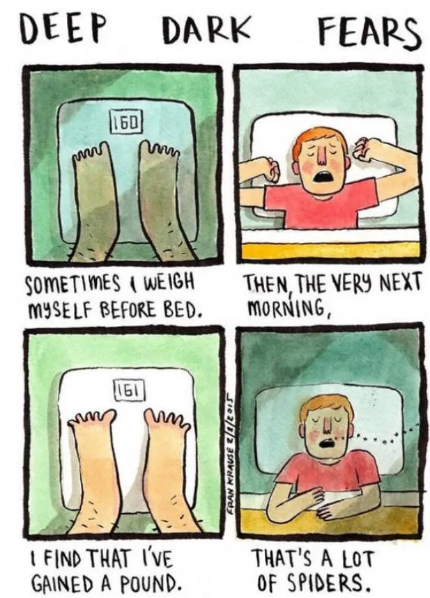 1.有时我上床睡觉前会称下体重,第二天早上再称,发现重量增加了,那绝对是很多蜘蛛爬进嘴里造成的。
